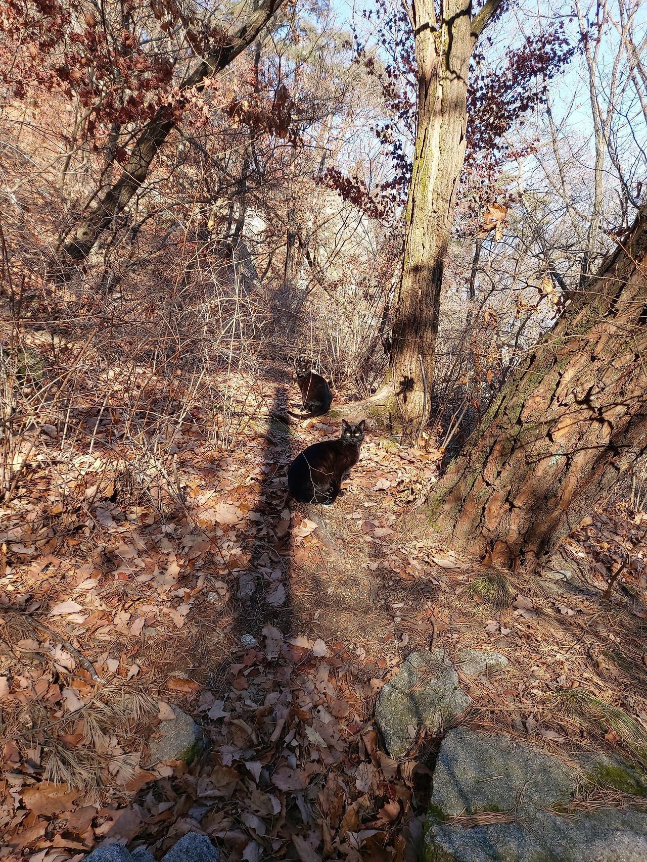 지난겨울, 자주 가던 산행로에서 고양이를 발견했다. 이 산에 오른 지 10년이 넘었는데 고양이를 발견한 건 처음이었다. 샛노란 눈동자에 까만 털로 뒤덮인 고양이 두 마리가 좁은 등산로 오른쪽 편에 앉아 무언가를 지켜보고 있었다.