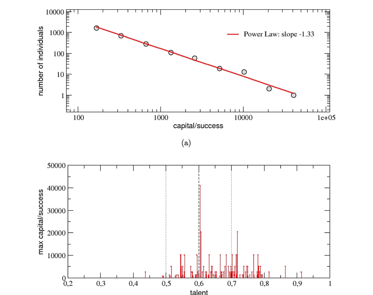 연구진이 에이전트 기반 시뮬레이션 모델(TvL 모델)을 통해 재능, 운 등의 조건을 설정하여 성공에 어떤 영향을 주는지 시뮬레이션한 결과에 따르면, 성공과 운 사이에는 강한 상관관계가 있지만 성공과 재능 간에는 뚜렷한 상관관계가 없다. 오히려 재능이 평균에 가까운 사람이 운이 좋아 보상을 독차지할 확률이 더 높았다. 재능은 정규 분포(normal distribution)를 따르지만, 성공은 *파레토(Pareto distribution) 분포를 따르기 때문이다.