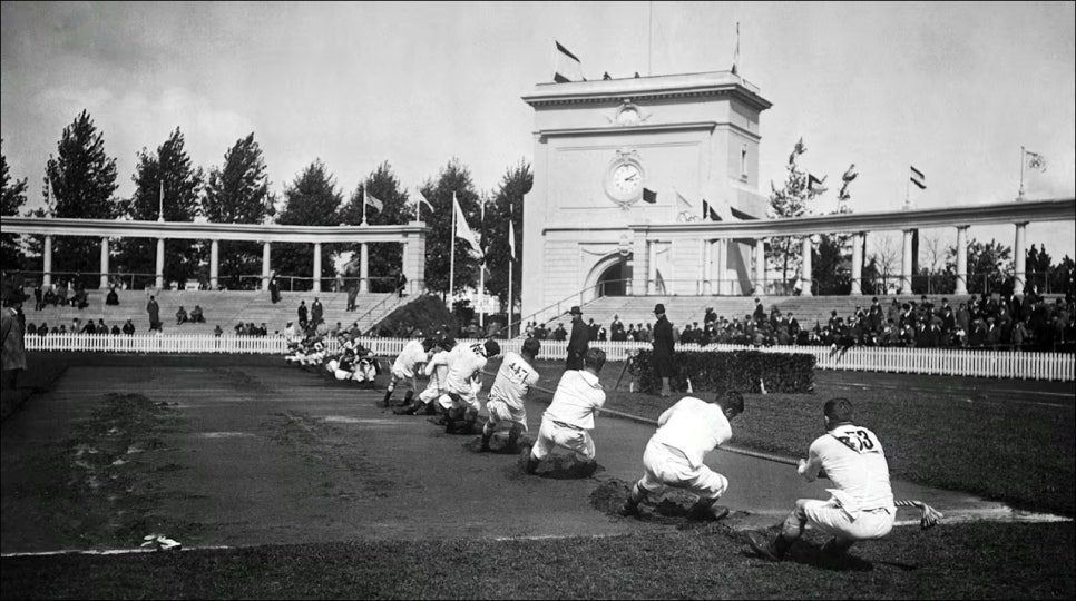 줄다리기는 인류의 보편적인 놀이로 공동체 정신과 집단의 단결력을 보여줄 수 있는 놀이죠. 줄다리기는 1900년 파리 올림픽에서 정식 종목으로 채택되어 1920년까지 인기리에 진행되다가 사라졌습니다. 왜냐면 강철 스파이크가 박힌 신발을 신었다가 항의가 일어나는 등 규칙에 대한 논란이 끊이지 않았고 1차 세계대전이 발발하면서 각 나라 간 갈등이 심화되어 줄다리기가 '위험 종목'으로 분류되었기 때문입니다. 집단 대결이 자칫 감정이 격화되면 사단이 일어날 수도 있는 일촉즉발의 시기였으니까요.