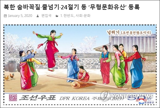 “북한 로동신문은 1월 5일 북한 민족유산보호국이 6개 대상을 국가 및 지방비물질문화유산으로 새로 등록했다고 보도했다”는 기사가 2020년 벽두에 나왔습니다. 위 기사 중 비물질문화유산은 무형유산을 말하는데, 그중 눈에 띄는 것은 <바줄당기기, 줄넘기, 숨박곡질>이 새로 등록됐다는 대목입니다. 로동신문의 이어진 설명을 보면, “줄을 돌리거나 고정시켜 놓고 그것을 넘으면서 노는 놀이인 줄넘기와 여러 명의 아이가 몸을 숨기면 한 아이가 숨은 아이들을 찾아내는 숨박곡질은 오래전부터 이어져온 대표적인 민속놀이들로서 오늘도 우리의 생활에 민족적 향취를 더해주고 있다”고 소개하는데 현재 우리 아이들이 놀고 있는 바로 그 놀이입니다. 바줄(밧줄)당기기는 줄다리기로 우리나라의 대표적인 민속놀이로 캄보디아, 베트남, 필리핀과 함께 유네스코에 2015년에 등재되어 있으니 국가무형유산으로 등재할만합니다. 그런데 그 뒤에 나오는 줄넘기나 숨바꼭질(숨박곡질)은 아이들이 골목에서 놀던 전래놀이인데 이게 어떻게 국가무형유산으로 등재될 수 있었을까 매우 궁금해졌습니다.