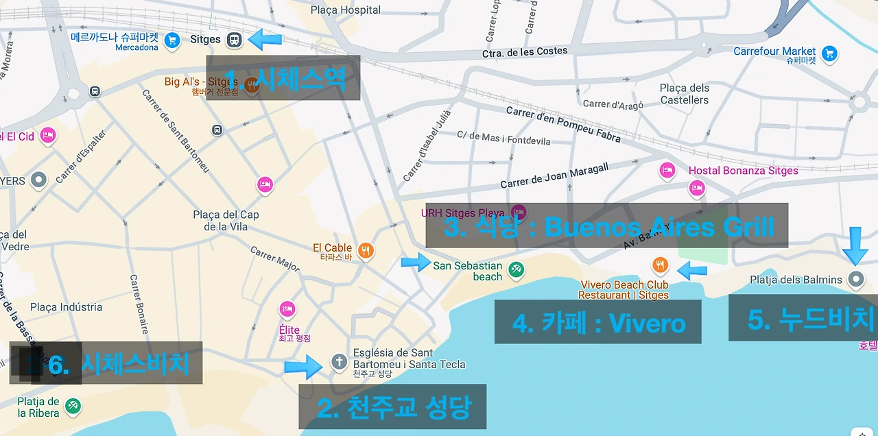 시체스역-천주교성당-식당-카페-누드비치-시체스비치