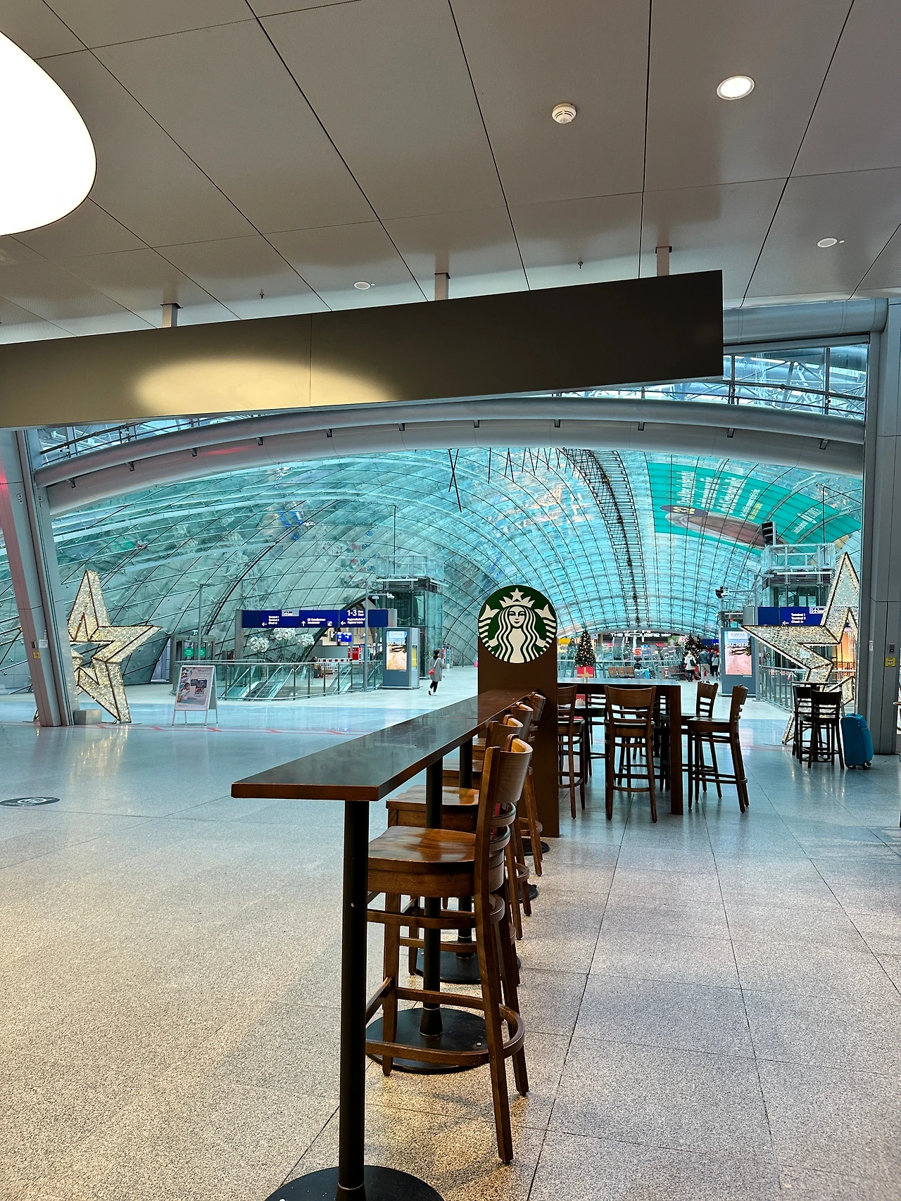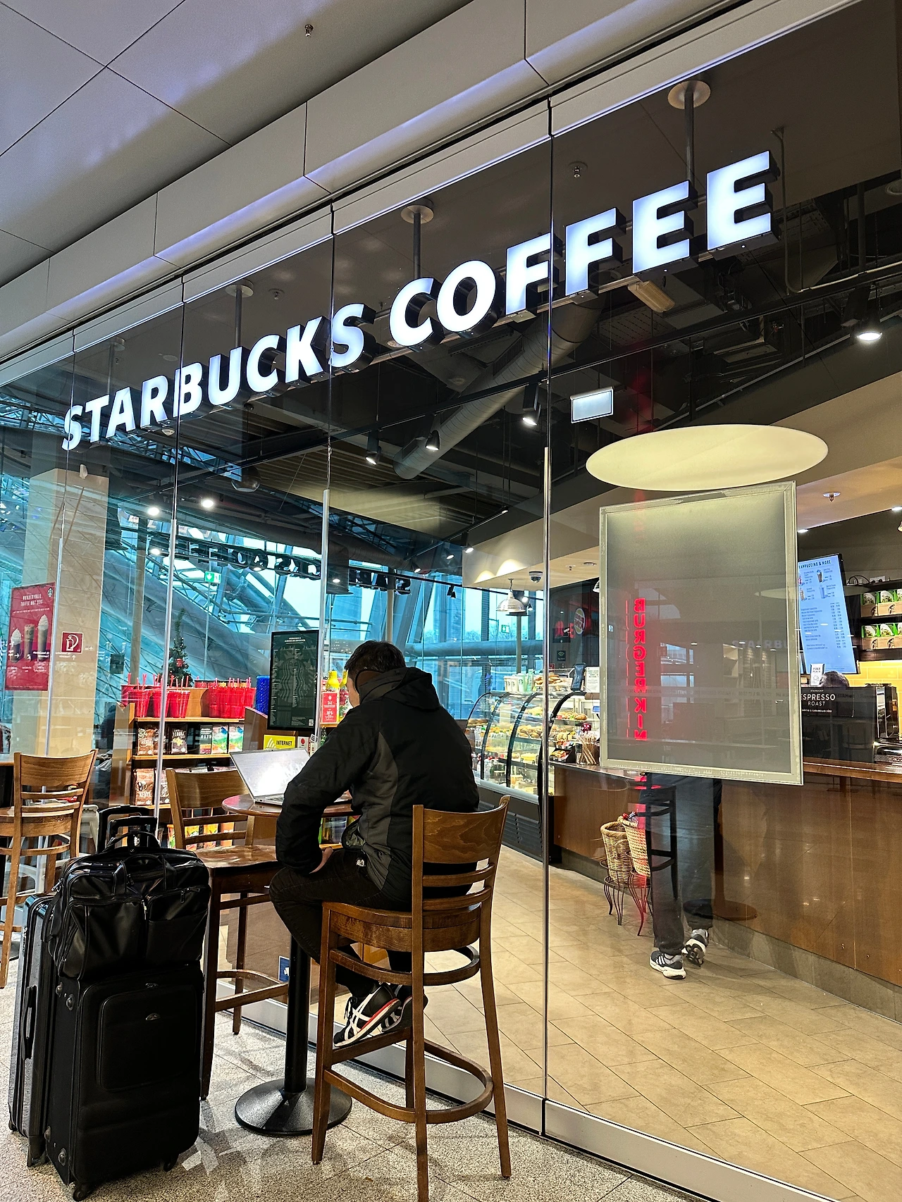 프랑크푸르트 공항의 스타벅스는 약 세 곳이 있는데, 모두 다 가본 결과 기차역 옆에 있는 지점이 가장 조용하고 좌석도 편안했다. 이곳은 터미널 1 기준으로 공항 내에서 도보로 약 10분 걸어야 한다. ICE나 IC 고속열차가 다니는 역인 'Frankfurt Flughafen Fernbahnhof (프랑크푸르트 공항 장거리역)' 입구 바로 앞에 있다.