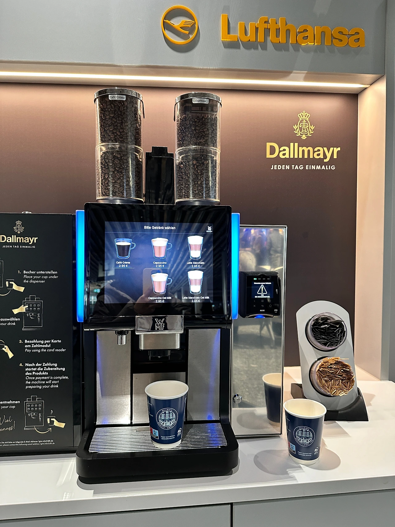 보안검색대를 통과하면 게이트 구역이 펼쳐지는데 잘 살펴보면 곳곳에 루프트한자에서 제공하는 커피머신이 있다. 무료는 아니지만 카드결제도 되고 아메리카노가 약 3유로(4200원)로, 공항에 입점한 타 체인카페들보다 확실히 저렴하다.