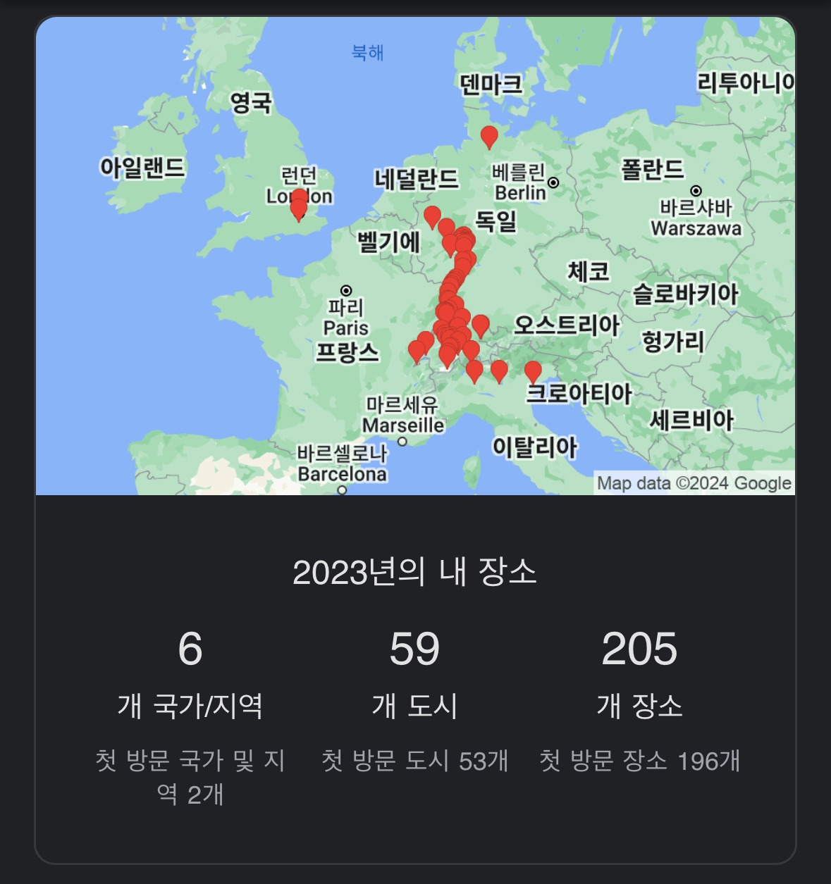 작년에 내가 방문한 국가는 총 6개(실제 8개), 첫 방문 장소는 아마 100개 정도일 텐데 이전 기록이 없어서 죄다 첫 방문으로 찍힌 것 같다. 아무튼 참 잘 다녔던 한 해였다. 독일 북부서 차 끌고 덴마크 가고, 독일 북부에서 남부 그리고 스위스에 걸쳐 출장도 정기적으로 다녔고, 등산하러 국경 넘어 리히텐슈타인에 가기도 했으며, 그와 별개로 틈틈이 가족과 유럽 여기저기를 정신없이 돌았다.