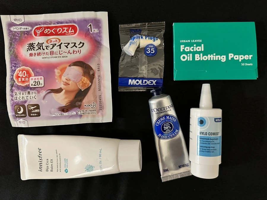 아래는 실제로 내가 가지고 다니는 기내용 필수품들이다. (슬리퍼 제외)