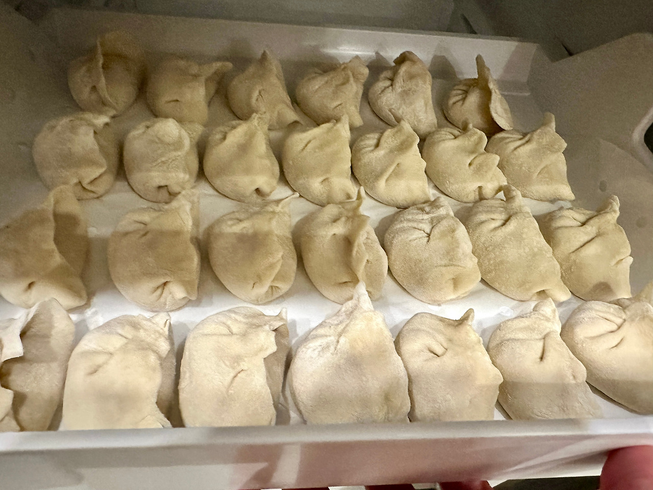 시어머니께서 매일 저녁 만두를 빚으셔서 매일 눈도 입도 즐거웠다. 손을 보태려 주방에 갔으나 어머니 속도를 도저히 따라가지 못했다. 만두 소로는 새우, 돼지고기, 절인 배추, 부추, 계란 등 다양한 재료가 들어가고 모두 호불호 없이 입에 잘 맞았다.