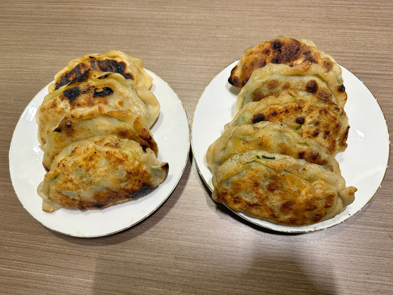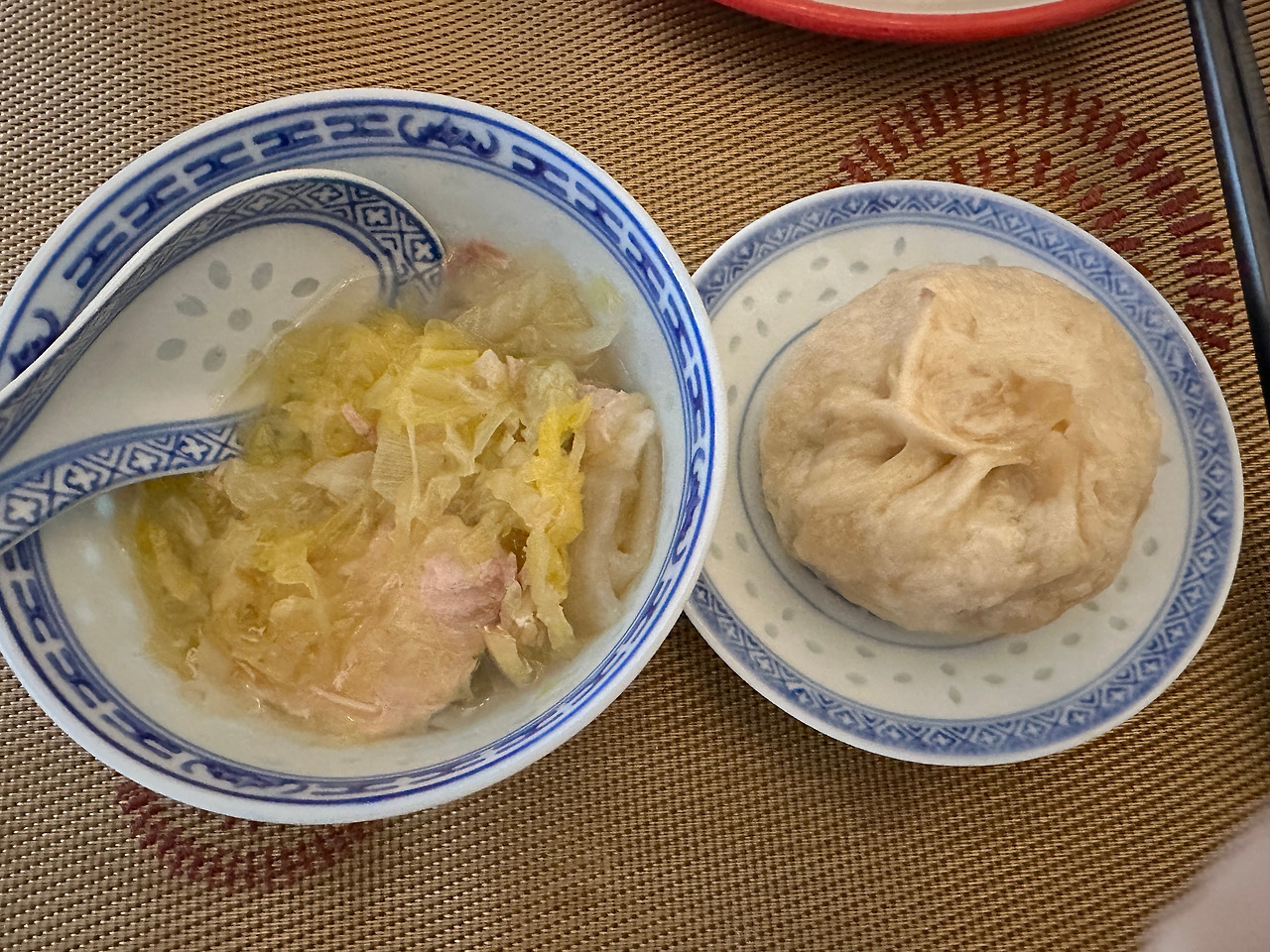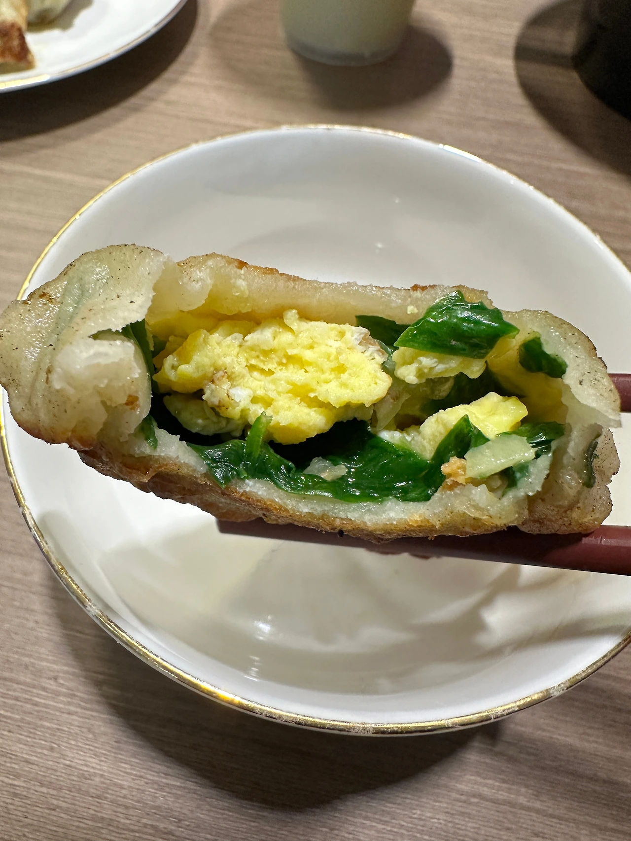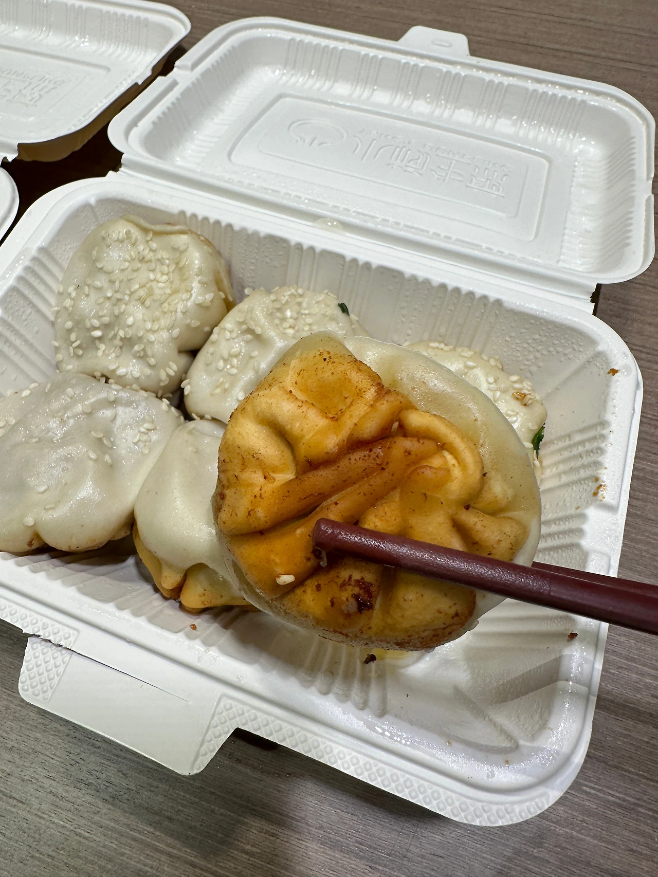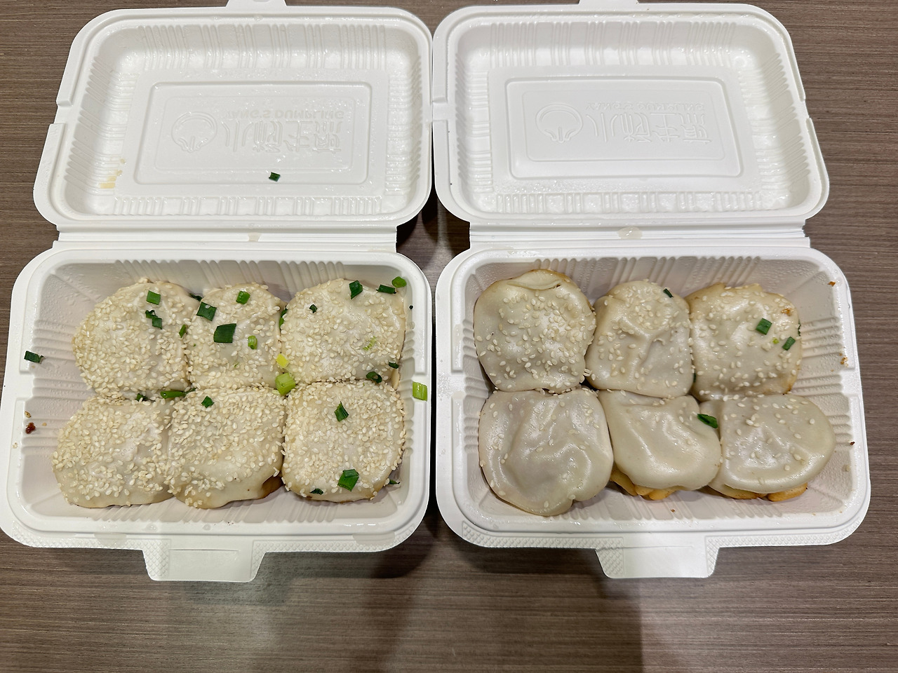 팬에 튀기듯 요리한 납작한 만두는 생소했는데 찌거나 탕에 넣는 만두와 다른 매력이 있었다. 아침식사로 먹기엔 살짝 부담스럽지만 출출할 때 한 두 개 간식으로 먹으니 다른 군것질거리 생각이 싹 달아났다.