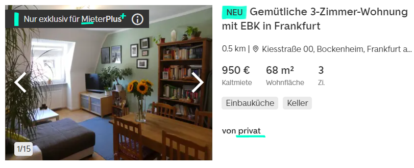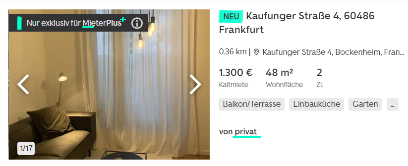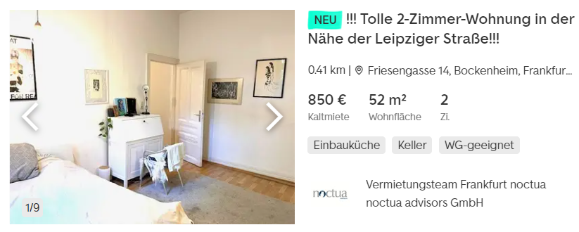 # 여기에 독일은 전세가 없으니 자가를 사지 않는 이상 월세를 살아야 한다. 퇴근 후 라이프와 접근성도 중요하므로 프랑크푸르트 시내에 산다고 가정해 보자. 아래 매물은 "난방/관리비/전기세/인터넷을 포함하지 않은 월세"다.