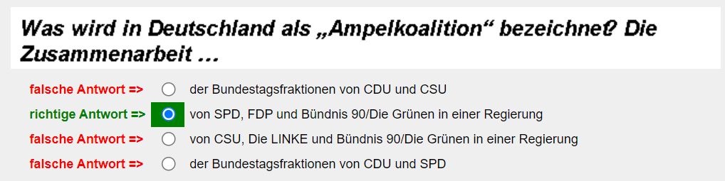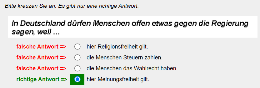 시험은 총 33문제, 합격 커트라인은 17문제(50%)로 상당히 여유롭다. 310개의 문제은행에서 무작위로 나오며 보기의 순서도 함께 바뀐다. 모두 고르시오는 없으며 문제 1개에 답도 1개다. 마지막 약 10개는 시험을 치르는 주(Bundesland)에 해당되는 내용이기 때문에 시민권 신청 시 주가 바뀌면 새로 시험을 쳐야 한다.