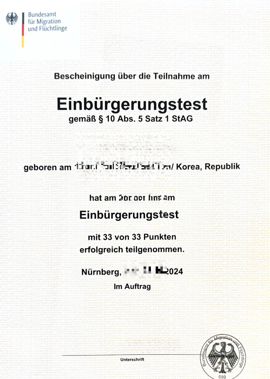 하지만 이 귀화시험은 사실 나에게 쓸모가 없다. 독일 시민권을 취득할 생각이 (아직) 없기 때문이다. 귀화한다, 시민권을 딴다는 말은 여권 및 국적이 바뀐다는 뜻이다. 즉, 귀화시험 증명서와 함께 다양한 서류를 독일 관청에 제출하여 승인되면 나는 더 이상 한국인이 아니게 된다. 한국은 이중국적을 허용하지 않기에 독일국적을 취득하면 한국국적은 포기해야 한다. 단, 한국도 만 65세부터는 이중국적을 허용하기에 일단 해외국적을 취득해 놓고 은퇴 후 한국국적을 다시 회복시키는 분들도 있다.