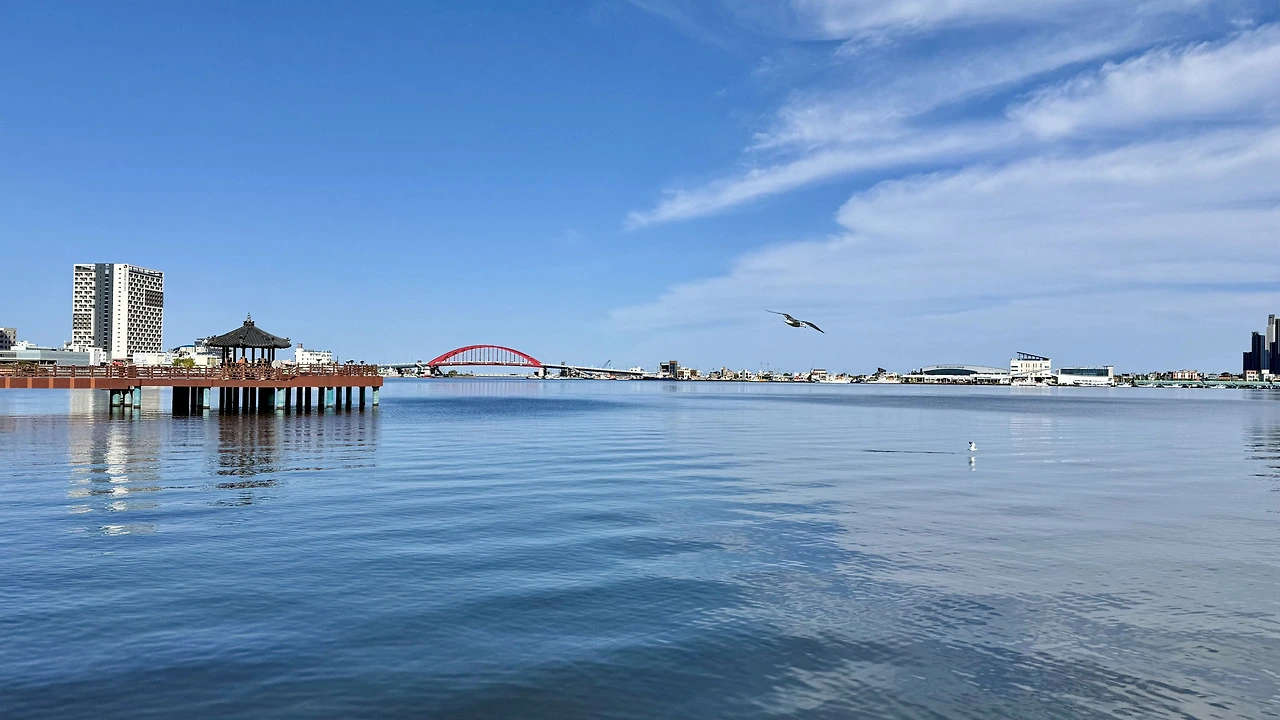 다리가 아프다며 업어 달라는 아이를 달래어 그늘막 벤치에 앉는다. 청초호 호수공원엔 쉼표처럼 놓인 벤치가 많다. 빨강, 노랑, 파랑, 알록달록한 그늘막 벤치 아래 앉으면 잠시 세상이 멈춘다. 저 멀리 보이는 설악대교의 붉은색과 청초호의 푸른색이 선명하게 대비된다.