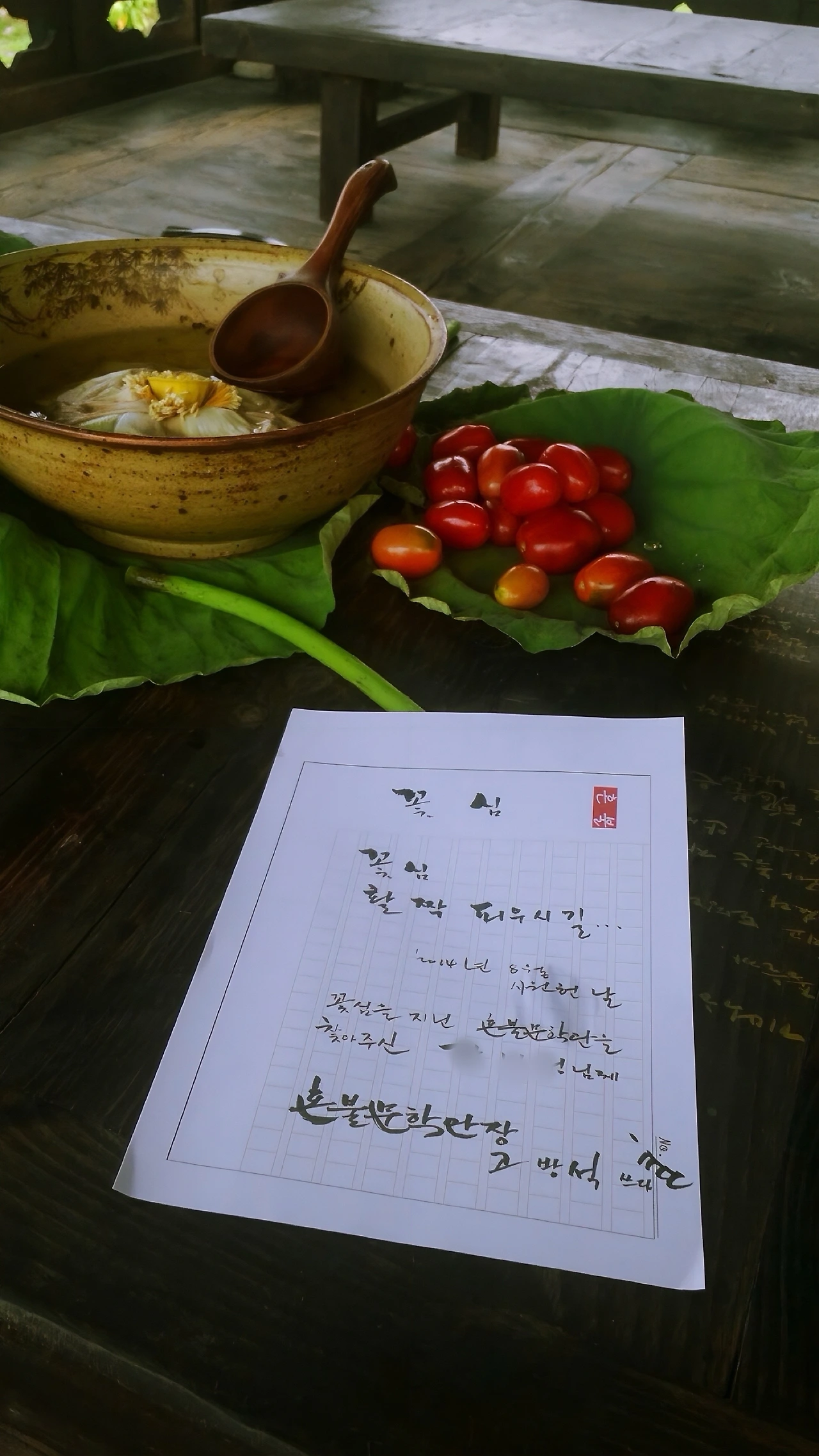 정자의 테이블 위엔 커다란 연잎 두 장이 깔려 있었다. 연잎 위 널따란 그릇에 새하얀 연꽃을 띄어 은은하게 차를 우려내고, 또 다른 연잎 위에는 새빨간 방울토마토를 소복이 쌓아두었다.