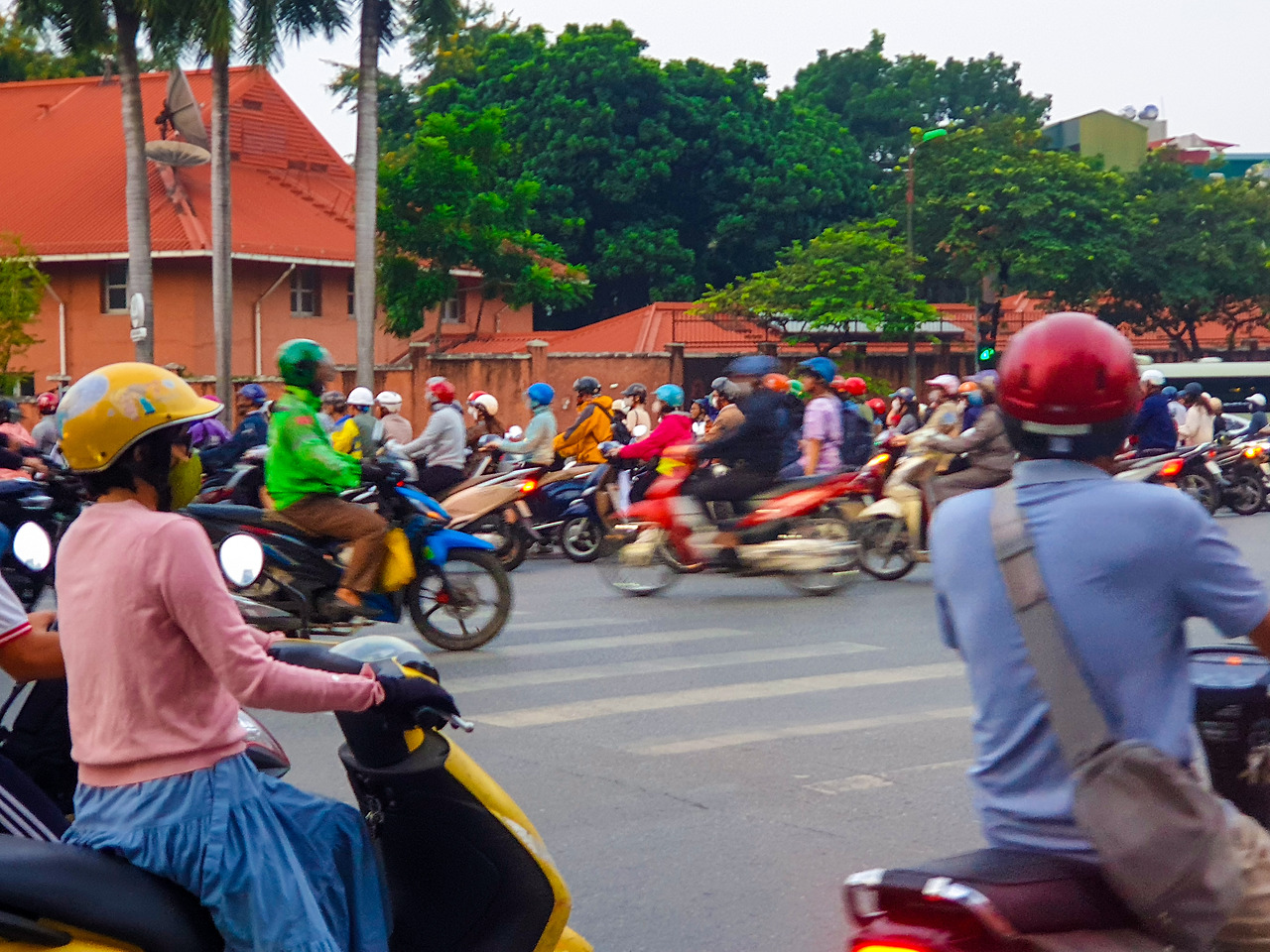 베트남의 도로 상황은 한국의 그것과는 사뭇 다르다. 사륜차보다 오토바이가 훨씬 많고, 횡단보도와 보행자 신호는 찾기 어려운 데다 있어도 차들이 잘 지키지 않고 그냥 지나가는 경우가 많다. 한국으로 따지면 건널목 앞 신호등에 파란불이 들어왔는데 비보호 우회전 차량 여러 대가 일시 정지도, 서행도 하지 않고 끝없이 꼬리를 물며 달려 들어오는 것 같은 상황이 모든 방향의 모든 도로에서 일어난다.