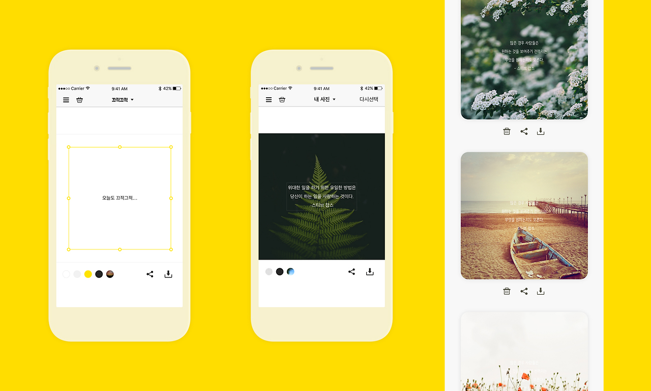 시각적인 UI들을 덜어내고 ‘3초만에 명언 만들기’라는 캐치프레이즈를 내건 이유도 유저가 영감 받을 문구를 기록하는 데에 초점을 맞췄기 때문이다. 내 머릿속 혹은 남겨두고 싶은 글귀가 시각적인 요소를 꾸미는 데에 많은 할애를 하지 않는 것에 더 목적을 두었다고 하는 것이 맞다.