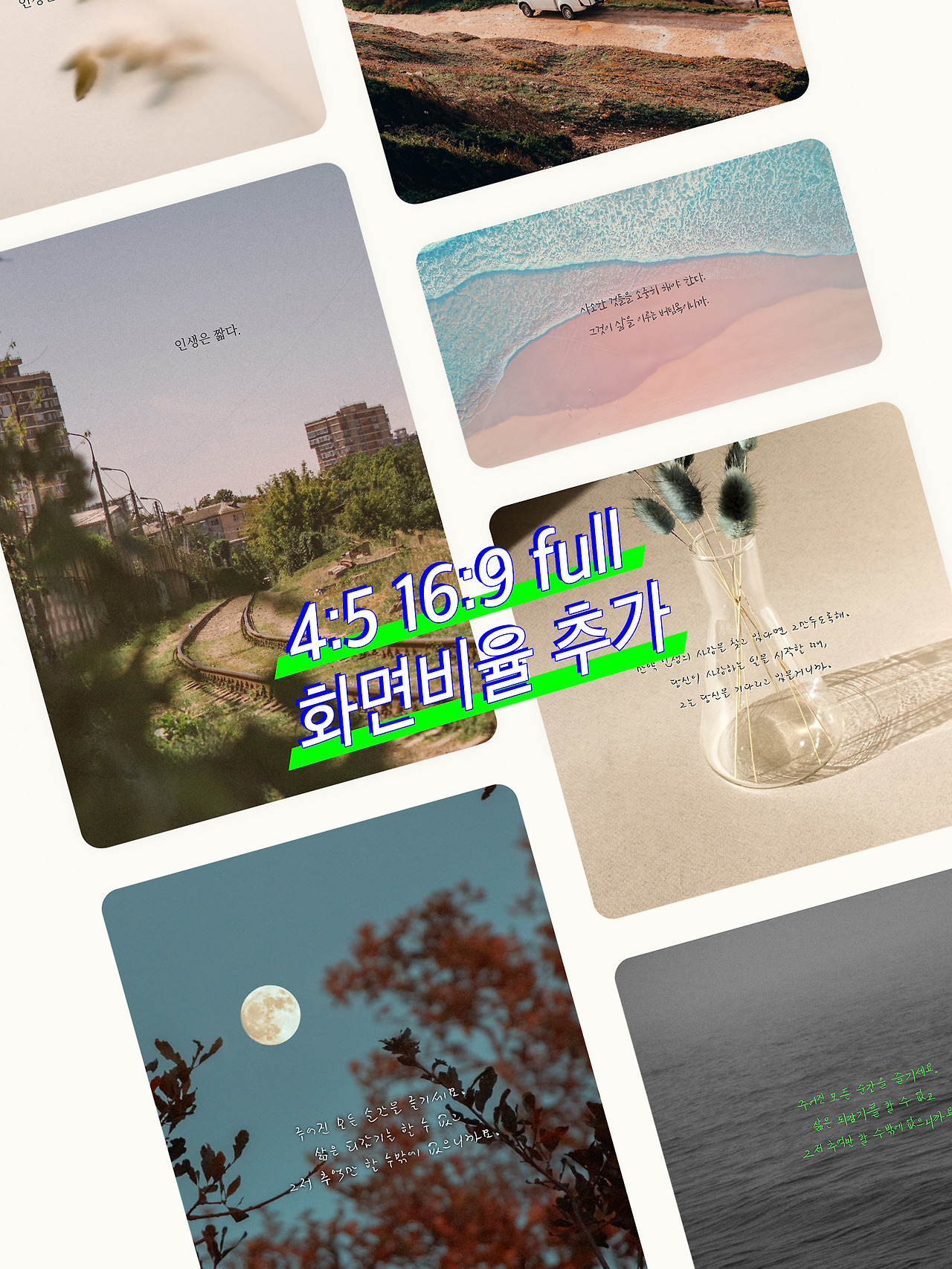 4:5 (인스타그램 사이즈)와 16:9 (유튜브 사이즈)와 full (배경화면 하기 딱 좋은 사이즈)가 추가됐다. 특히 full 사이즈를 통해 아이폰과 아이패드의 홈 화면/잠금화면 배경 이미지를 끄적글적으로 손쉽게 만들 수가 있다.