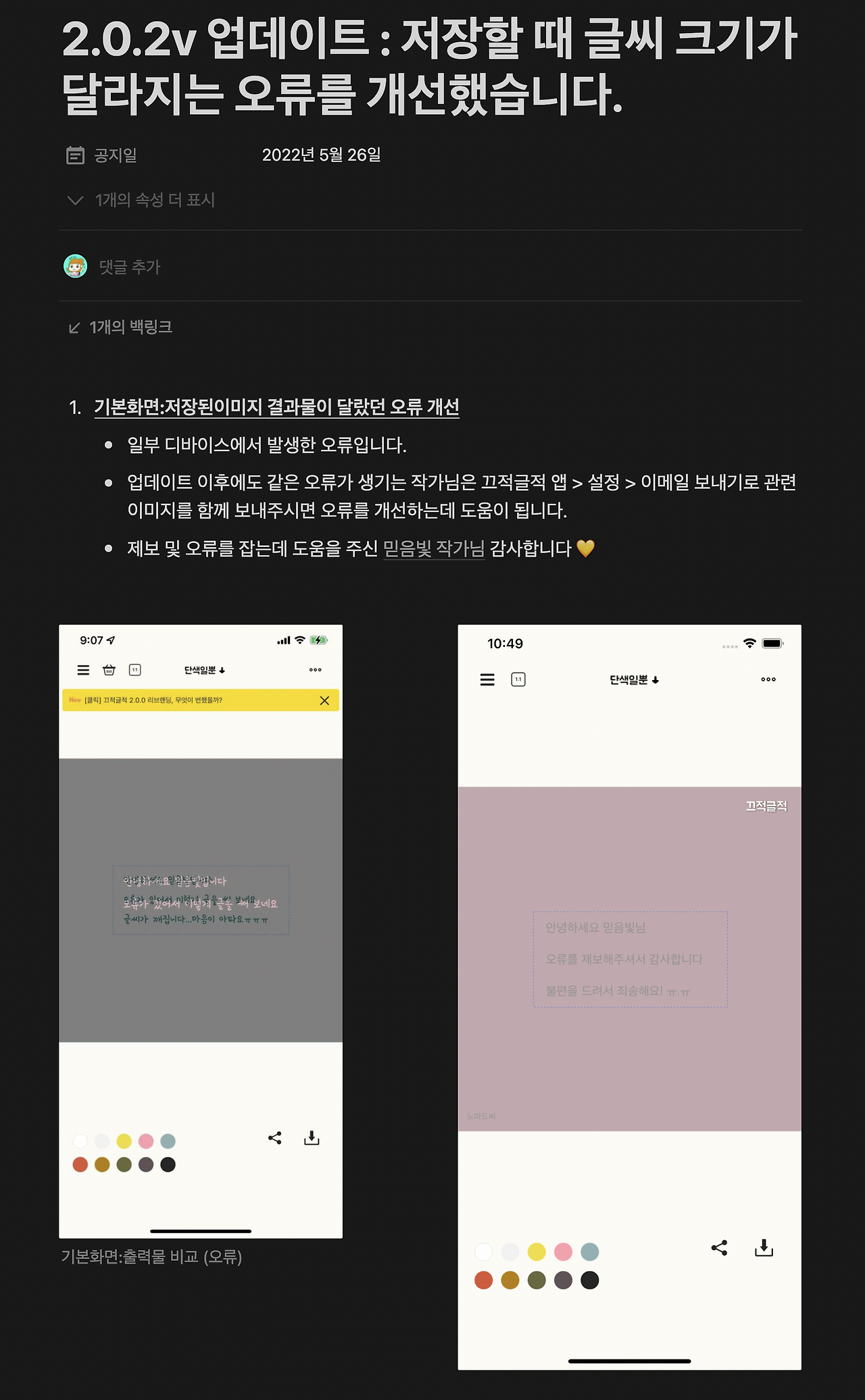 2.0.0v버전 이후 애나와 내가 발견하지 못한 크리티컬 한 이슈들을 사용자들에게 제보를 받았고 일주일 동안 업데이트를 4번이나 올렸다. (극단적인 업데이트 주기) 역시나 시뮬레이터로는 한계가 있고 둘이서 일하는 우리는 디바이스가 한정되어있기에 모든 오류 케이스를 발견할 순 없었다. 다행히 작가님이 감사하게도 친절하게 답변을 해주셔서 빠르게 파악할 수 있었다. (자세한 정보는 링크 참조)