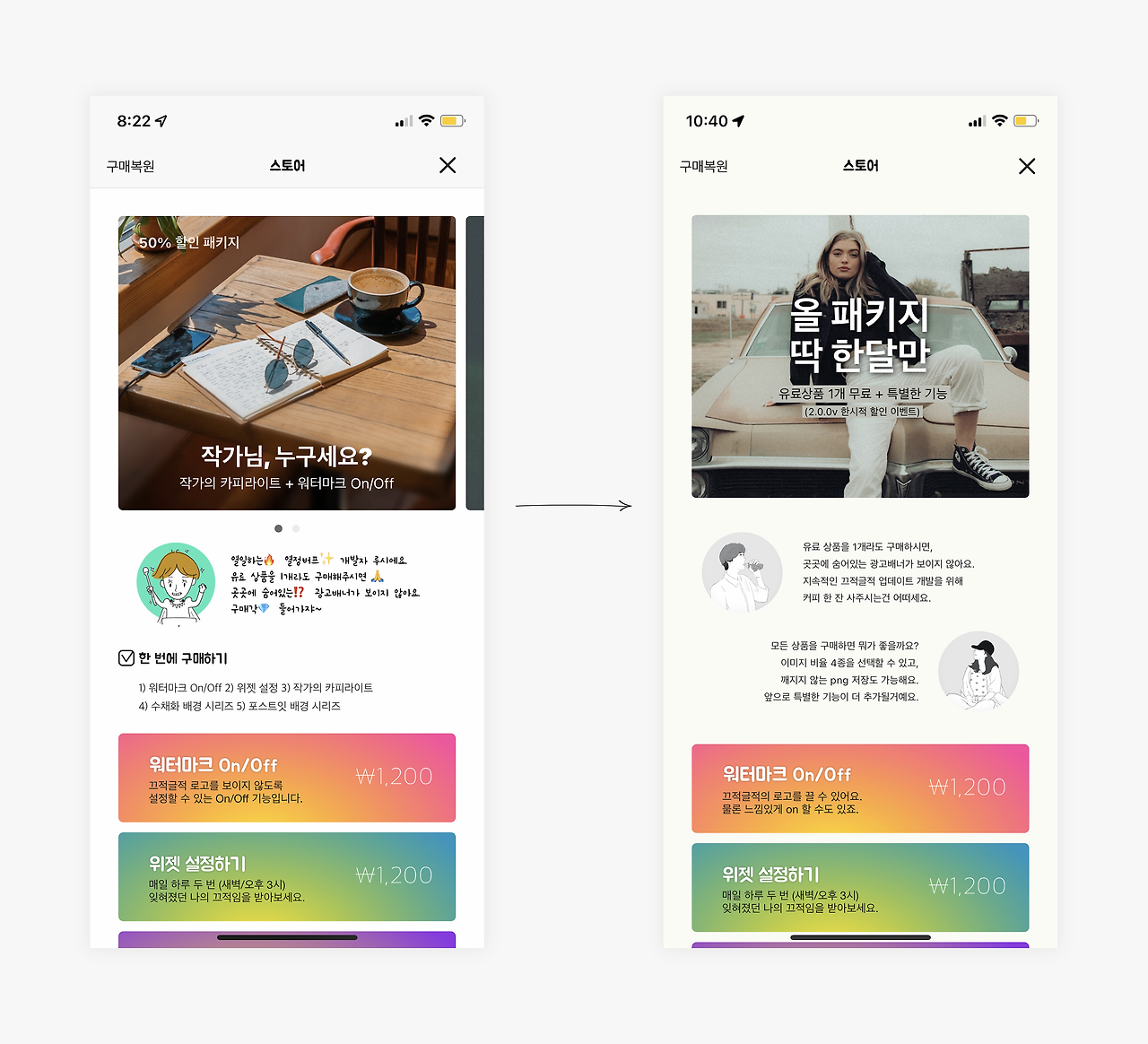 스토어 화면도 많이 바뀌었다. 올패키지 상품이 생겼고 더 미니멀해졌다. 그러니 구매 많이 해주십사...(하뚜)