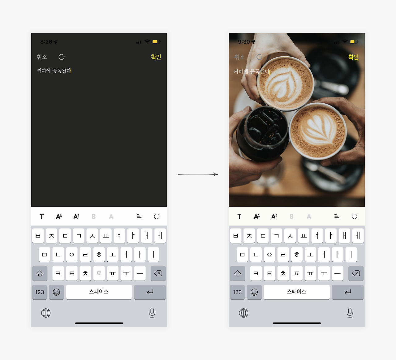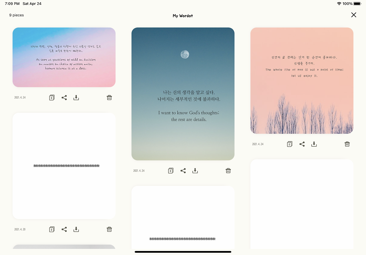 이전부터 개발하고 싶었던 모습이었다. 선택한 사진이 편집 화면에 직관적으로 노출되는 모습이 너무 마음에 든다. 현재 텍스트가 사진이랑 어떤 모습으로 어울리는지 즉각적으로 볼 수 있어서 좋고 무엇보다 더 집필에 집중이 잘 된다. 개인적으로 만족감이 높은 화면이다.