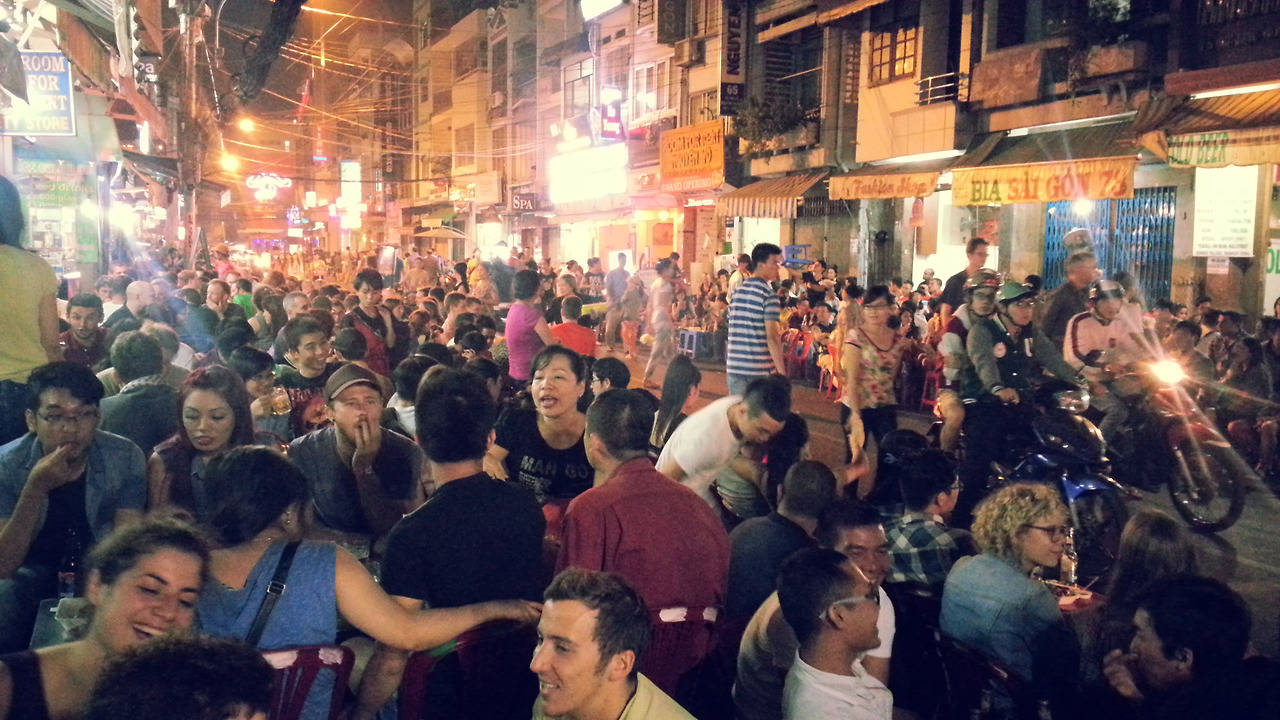 숙소가 있는 지역은 '데땀'이라고 불리는 호치민의 여행자 거리. 매일 저녁마다 전 세계에서 몰려든 여행자들의 맥주판이 벌어지기로 유명하다. 한 밤의 맥주 거리는 흥이 넘실넘실. 수많은 사람들이 서로 뒤엉켜 작은 목욕탕 의자에 앉아 맥주를 마시고 있었다. 발디딜 틈도 없이 꽉 찬 공간은 어디까지가 가게이고 어디까지가 도로인지 분간도 안되었다. 그 광경을 바라보며 멍하니 서 있는데 앉아서 맥주를 마시던 누군가가 말을 걸어왔다. 이봐, 혼자 온 거면 여기 와서 앉아. 우린 싱가폴에서 왔어. 나는 스테파니, 이쪽은 마이크. 여기 사이공 맥주 한 병 추가요! 맥주에 이끌려 털석 앉고 보니 앉은 자리가 꽃자리가 아니라 앉은 자리가 술자리! 치어스!