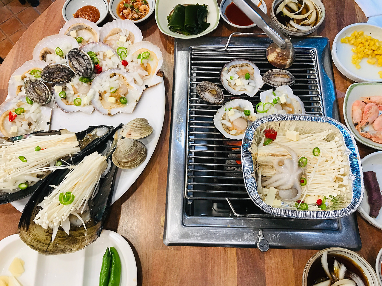 그중에서도 송정해변에는 갓 잡은 조개구이를 파는 가게들이 밀집해 있는 곳으로 유명하답니다. 풍미를 더 할 버터와, 치즈를 조개 위에 살짝 얻어서 함께 구운 조개구 이는 부산에 왔다면 먹어봐야 할 대표 음식이에요.