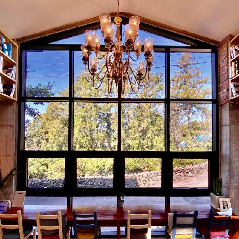 카페분위기의 통창이 있는 넓은 라운지에서는 책과 영화를 즐길 수 있다.