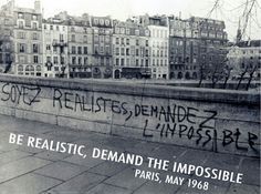 제가 이 사진을 처음 접한 것은 조지 카치아피카스의 책, [신좌파의 상상력](원제: Imagination of the New Left)을 통해서였습니다. 1987년 브루클린에 있는 South End Press 출판사에서 초판이 나왔고, 1999년 '이후' 출판사에서 이재원 선생의 번역으로 한국에 처음 나온 책이지요. 이 표지 사진은 68 혁명의 이념에 딱 맞아떨어집니다. 어째서 그럴까요? 왜냐하면 68 혁명은 기존의 1917 러시아 혁명식 정치혁명과는 다른 면모, 즉 학문-문화혁명의 모습을 많이 함축하고 있기 때문입니다. 68 혁명의 이념을 표현한 구호들이 많이 있지만, 전 다른 무엇보다 아래의 말을 좋아합니다.