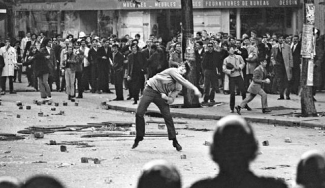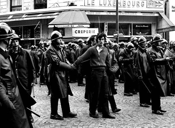 5월 3일, 불길은 소르본 대학으로 옮겨 붙었습니다. 학교 영예의 전당에서 집회와 토론을 이어가던 학생들에게 경찰들이 들이닥친 것이지요. 낭테르처럼 되는 것을 두려워한 로슈 총장의 요청에 따른 것이었습니다. 학생들은 순순히 닭장차에 올라탔습니다. 하지만 그때 사건이 발생했지요. 주위를 둘러싸고 있던 학생운동 진영이 아니었던 일반학생들이 분노하기 시작한 것이지요. 그 무리로부터 첫 번째 짱돌이 날아갔습니다. 그리고 경찰차 앞유리를 박살 내면서 운전석의 경찰 머리를 강타했지요. 이후 경찰들의 대응은 무자비했습니다. 소르본 대학 ‘영예의 교정’과 그 앞 ‘소르본 거리’가 일순간 아수라장으로 변했숩니다.