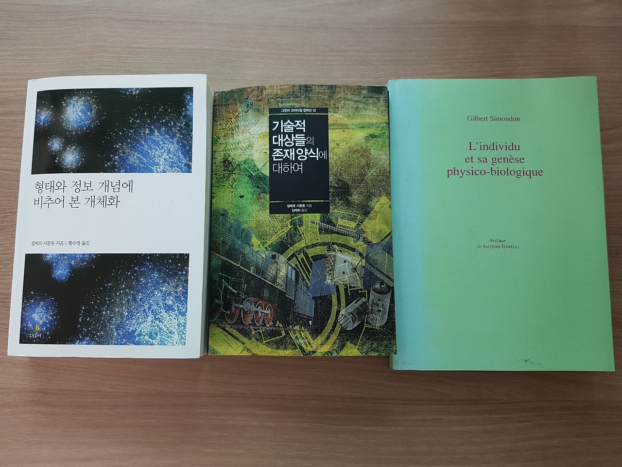 시몽동은 프랑스의 수재들만 간다는 '에꼴 노르말 수프리외', 즉 '고등사범학교'와 소르본 대학에서 철학을 전공했지요. 스승들도 쟁쟁합니다. 조르쥬 캉길렘(이 분은 과학철학자이고 들뢰즈의 스승이기도 합니다), 마르시알 게루(스피노자 철학의 권위자입니다), 모리스 메를로-퐁티(유명한 현상학자이지요)가 그들입니다. 1958년에 박사학위를 받고 소르본과 푸아티에, 파리 4 대학에서 학생들을 가르쳤습니다. 그리고 <일반 심리학과 기술공학 실험실>을 설립하여 연구활동에 매진했습니다. 주요 저서는 박사학위 논문([형태와 정보 개념에 비추어 본 개체화])인데요 이 논문은 처음엔 두 부분으로 나누어서 출판됩니다. 왜 그랬는지는 저도 잘 모르겠습니다. 논문 전체가 온전히 출간된 것은 2005년이고, 밀롱(Millon) 출판사에서 나왔습니다(2013년에 개정판이 나왔지요). 그리고 부논문도 아주 중요합니다. 프랑스에서는 대체로 이렇게 주논문과 부논문 2개를 박사학위 논문으로 씁니다. 부논문은 [기술적 대상들의 존재양식에 대하여]입니다. 시몽동의 주논문과 부논문 둘 다 한국어 번역판이 있어요(번역자들의 노고에 박수를!)