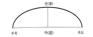 이 도식이 의미하는 바는 최고의 지혜로운 선택 즉, 윤리적으로 가장 선한 선택이란, 양극단의 중간이 아니라(그것은 오히려 '악'입니다.) 그 양극단을 '떠난' 최상위의 선택이라는 것이지요. 여기서 악에서 선으로 가는 가느다란 선은 바로 '지혜'의 고양 단계를 의미합니다.