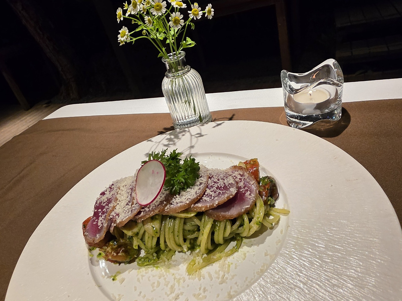하루하루 지날수록 야속한 시간은 왜 이리 빨리 가는지 마지막날의 어둠이 예외 없이 찾아왔다. 어제 다짐했듯 오늘은 만반의 준비를 하고 야외에서 식사를 하기 위해 직원에게 야외 테이블을 부탁했다. 비가 오지 않아 저녁 식사를 하기엔 기온이 괜찮았다. 실내보단 야외가 식사의 기분을 한층 더 끌어올렸고 고요하고 포근한 저녁의 분위기를 음식과 곁들이기 좋았다. 마치 어릴 적 상상했던 동화 속 풍경에 들어간 듯한 기분이 들었다.