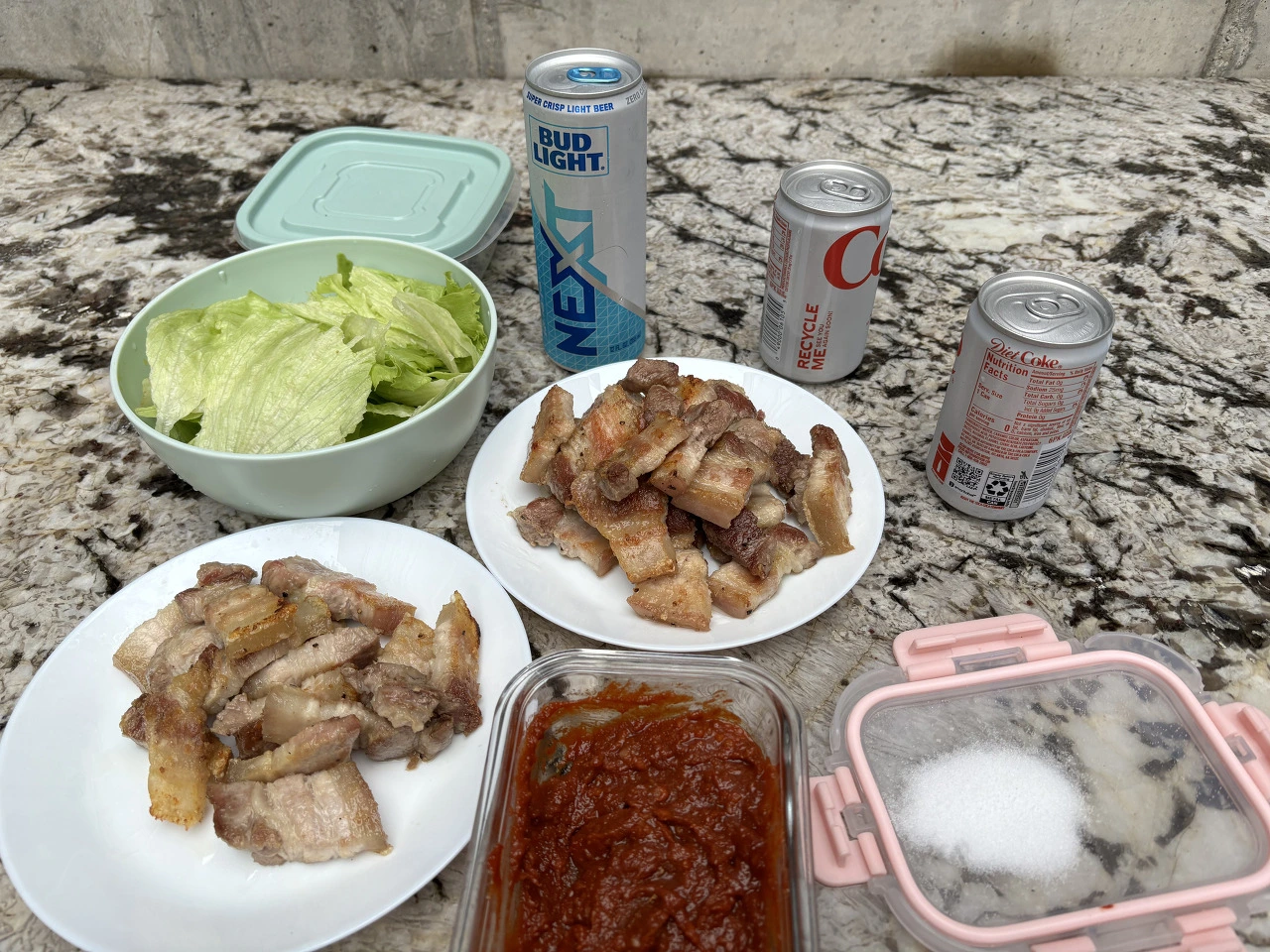 살짝 몽롱한 상태로 고기가 선홍빛에서 먹음직스럽게 노릇해지는 걸 구경했다. 두툼한 오겹살과 삼겹살이 나란히 익어간다. 친구가 적당히 익은 고기를 한 입 크기로 자를 때즈음, 테이블을 닦고 반찬을 하나씩 올렸다. 깻잎과 상추 대신 양상추를, 쌈장 대신 어설프게 섞은 고추장과 된장을 세팅했다.