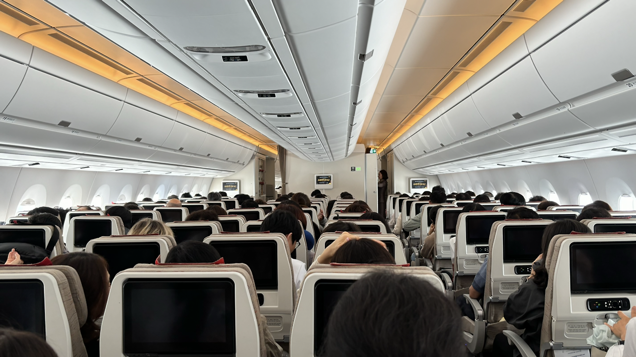 이번엔 아시아나를 택했는데, 오전 11시 50분에 출발하는 비행기였다. 11시 20분부터 보딩인데, 줄이 줄어들 때까지 기다렸다가 느긋하게 30분쯤 타러 갔다. 장기 비행이니 기종은 A350-900으로 큰 비행기였고, 구조는 이코노미 기준 3-3-3이었다. 5월 초에 연휴가 많아서 그런지, 거의 만석이었다. 어매니티는 단출했다. 베개, 담요, 작은 파우치 하나가 전부였다. 파우치엔 슬리퍼와 일회용 양치 도구가 들어 있었다.