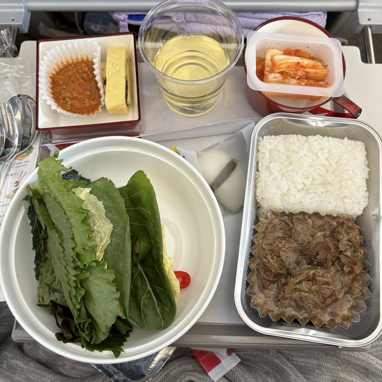 이륙하고 나서 한 시간쯤 지나 첫 식사가 나왔다. 불고기 쌈밥과 치킨 데리야키 중에 고르면 되는데, 아시아나는 뭐니뭐니해도 쌈밥이지. 역시나 무난하게 맛있었다. 달달짭짤한 불고기에 넉넉한 쌈 야채. 여기에 입가심으로 바람떡까지.