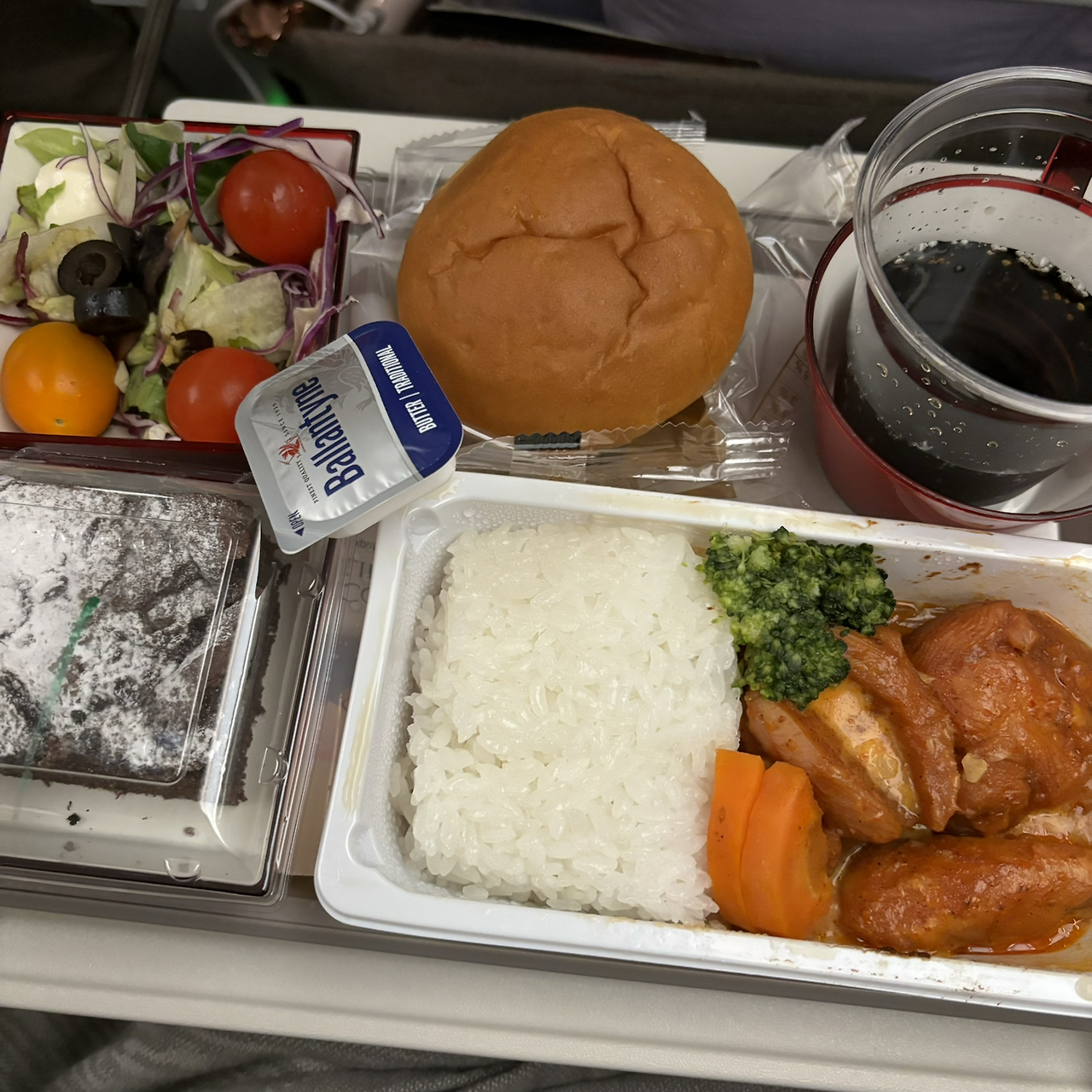 여섯 시간 후 두 번째 식사가 나왔다. 새우볶음밥과 고추장 로제 치킨 백반 중에 고르는 거였는데, 망설임 없이 후자를 골랐다. 닭고기도 닭고긴데, 한국식 로제 소스는 못 참지. 불고기 쌈밥보다도 맛있게 먹었다. 매콤한 양념의 닭고기도 맛있었고, 샐러드부터 브라우니인 척하는 초코 파운드케이크도 괜찮았다.