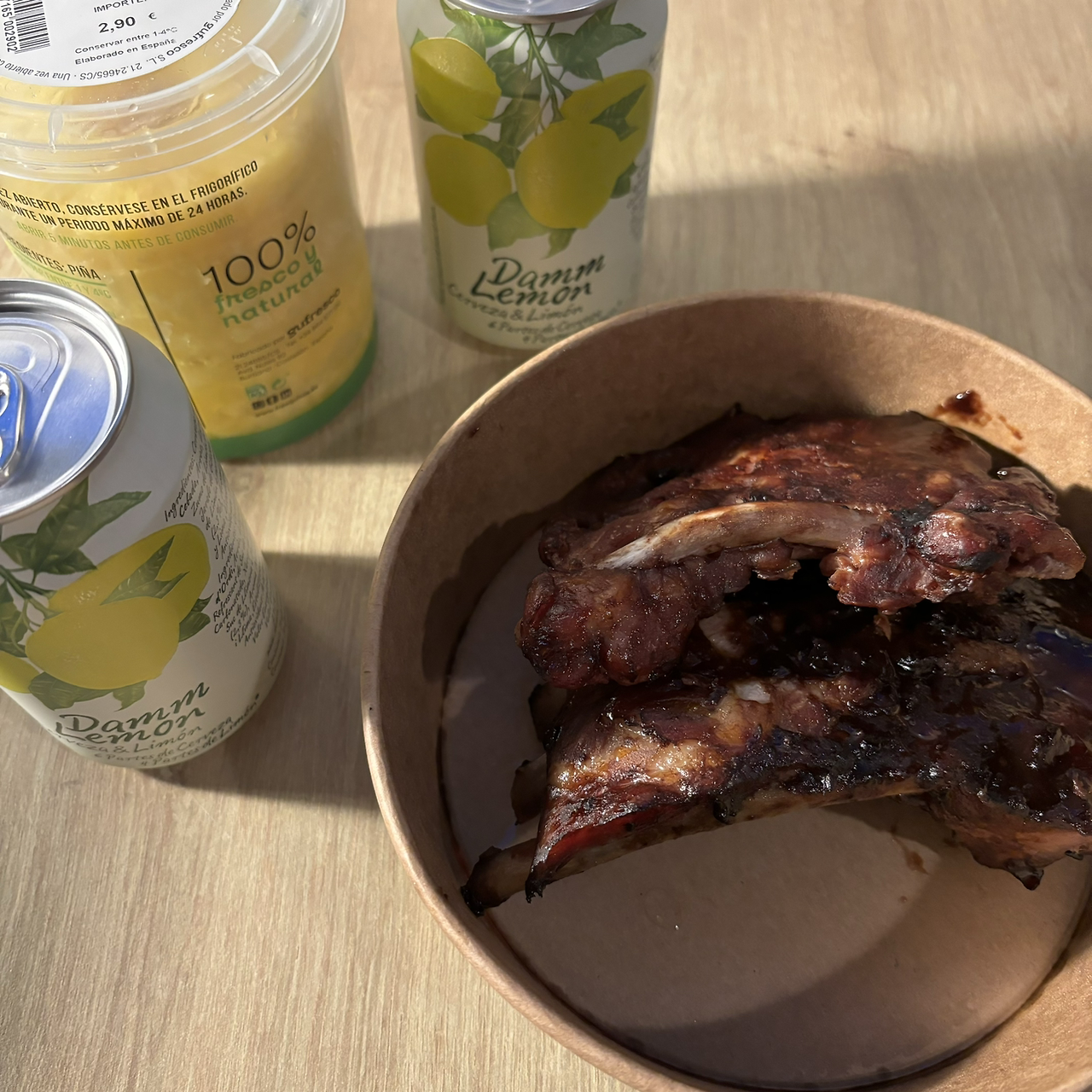 숙소 앞엔 대형 까르푸가 있었다. 저녁 8시에도 밖은 환했지만, 오랜 비행으로 너무 피곤했던지라 가볍게 저녁거리만 사 오기로 했다. 바르셀로나 오면 꼭 마셔봐야 한다는 클라라 레몬 맥주, 친구가 고른 립, 그리고 파인애플까지 숙소 테이블에 가볍게 차렸다. 반쯤 자고 있는 상태로 이런저런 얘기를 하다 날이 깜깜해졌다.
