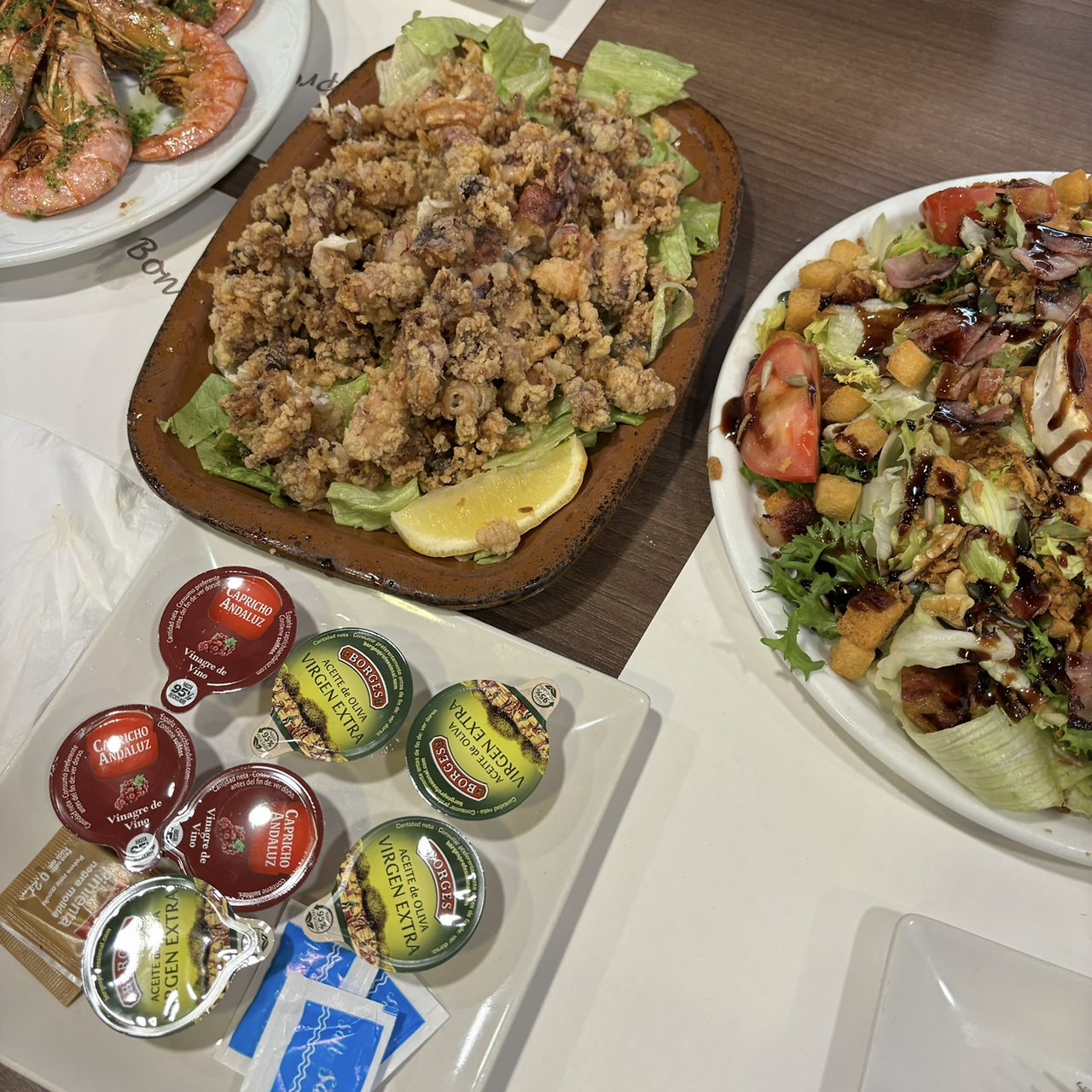 저녁도 근처에서 먹기로 했다. 'Saltapes Bar'라길래 평범한 타파스 바인 줄 알았다. 분명히 가볍게 먹기로 했는데... 직원분들은 영어를 못했고, 우리는 스페인어를 못했다. 파파고의 도움을 받아 어떻게든 주문했다. 가격도 저렴한 데다 타파스처럼 조금씩 나오는 메뉴인 줄 알고 네 개를 주문했는데, 옆 테이블을 끌어와 붙여야 할 정도로 큰 접시에 줄줄이 나왔다. 꼴뚜기 튀김, 새우구이, 치즈 샐러드, 토마토소스 올린 바게트까지.