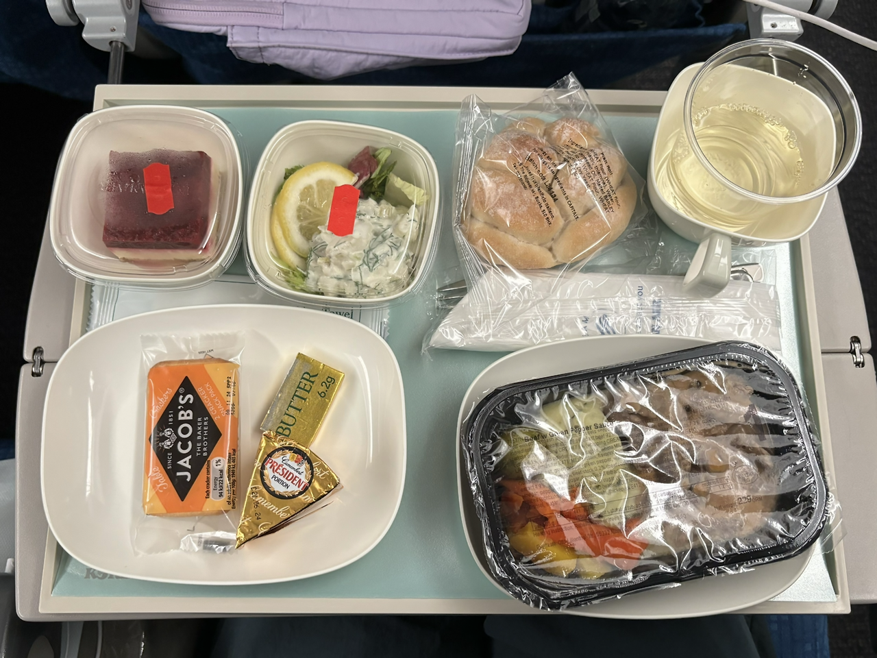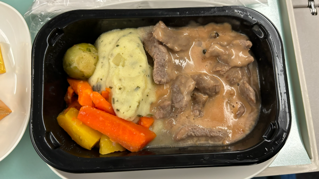 이륙하고 나서 얼마 안 되어 첫 번째 기내식이 나왔다. 아시아나는 쌈밥, 대한항공은 비빔밥이 정석이라지만 왠지 다른 걸 먹어보고 싶었다. 다른 옵션이었던 소고기 스튜를 골랐다. 오... 소고기도 감자도 엄청 부드럽다. 까망베르 치즈가 있길래 음료는 화이트 와인으로. 자고 싶어서 두 잔이나 마셨는데 잠이 하나도 안 왔다...