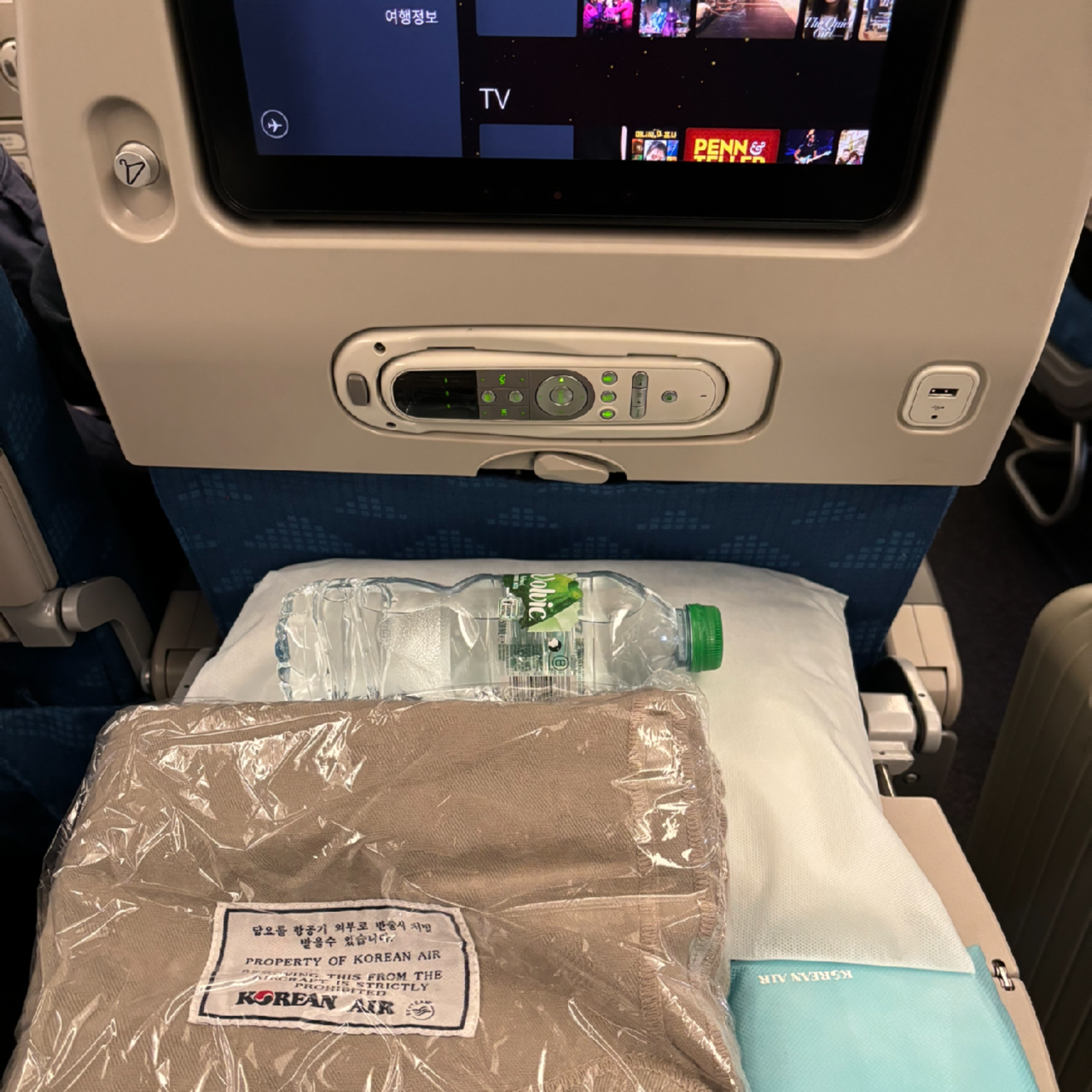 타본 비행기 중에 제일 쾌적했다! 일단 좌석 간격이 사방으로 널널했다. 스크린도 완전 신형이라 좋았다. 어메니티라고 할 건 슬리퍼와 양치 도구 외엔 없었지만, 아무렴 어때.