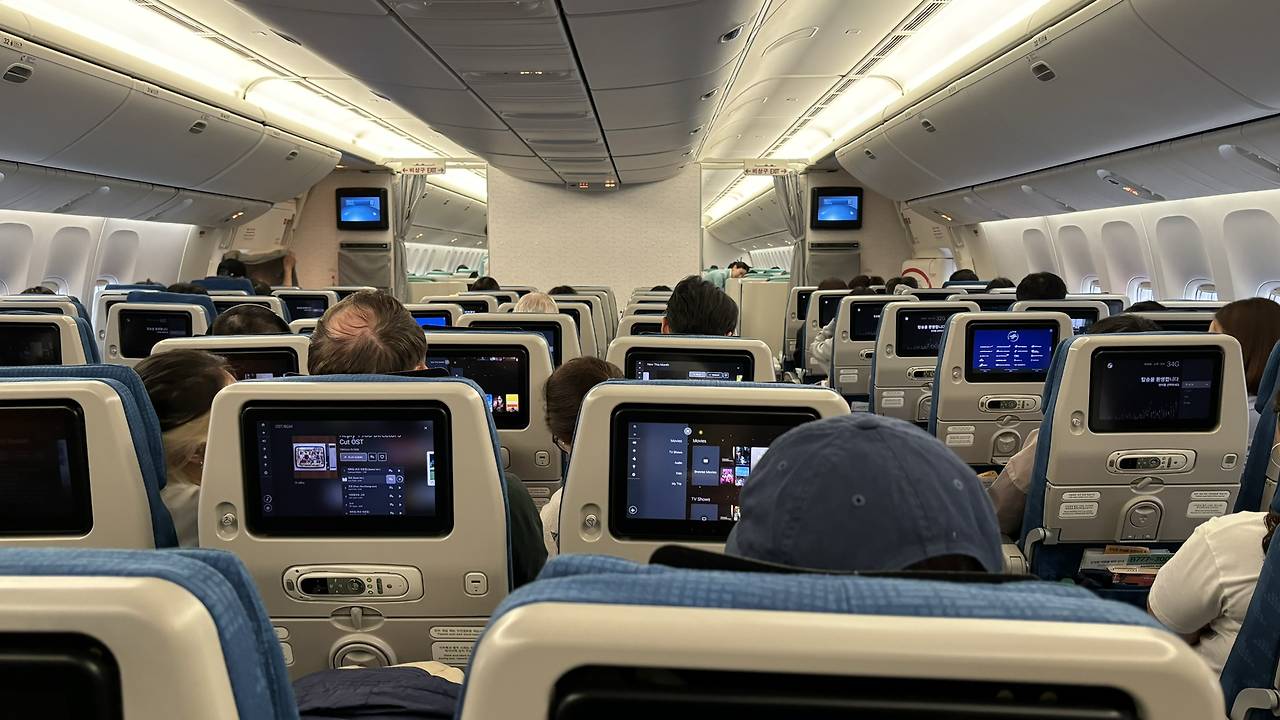 대한항공 KE908 편의 항공 기종은 B777-300이고, 좌석 구조는 이코노미 기준 3-3-3이었다. 인천에서 바르셀로나로 갈 땐 비행기가 만석이었는데, 런던에서 인천으로 돌아가는 이 비행기는 빈자리가 꽤 있었다. 내 옆자리도 운 좋게 공석이었다.