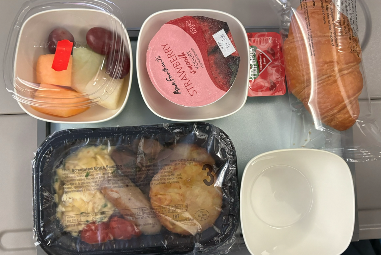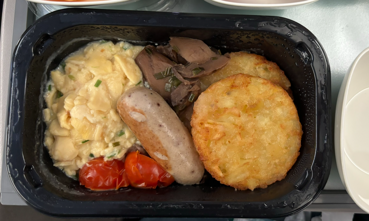 착륙하기 두 시간 전에 두 번째 기내식이 나왔다. 흰 죽과 계란요리 중에서 골라야 하는데, 고민 없이 후자를 골랐다. 죽은 아플 때만 먹어야지. 고도가 높으면 미각이 둔해져서 음식의 맛이 덜 느껴진다는데, 이마저도 매번 맛있게 먹는 걸 보면 나도 참 먹는 거 좋아한다. 스크램블 에그, 소시지, 버섯, 해시브라운. 소박한 구성인데 맛이 괜찮았다.