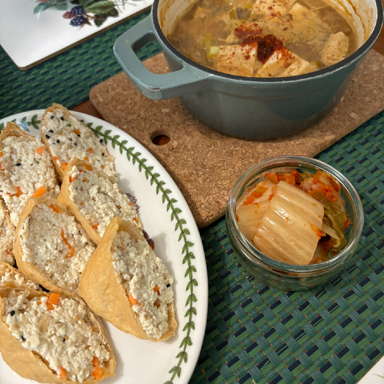 친구가 영혼까지 수분을 짜낸 두부에 오트밀밥을 섞어 유부를 채웠다. 이번에 친구한테 지어준 별명이 있는데, '꼼꼼한 큰손'이라고. 서두르지 않고 꼼꼼히 요리를 하는데, 완성된 걸 보면 접시에 한가득이다. 그리고 자꾸 '할 수 있다'며 더 먹으라고 한다.