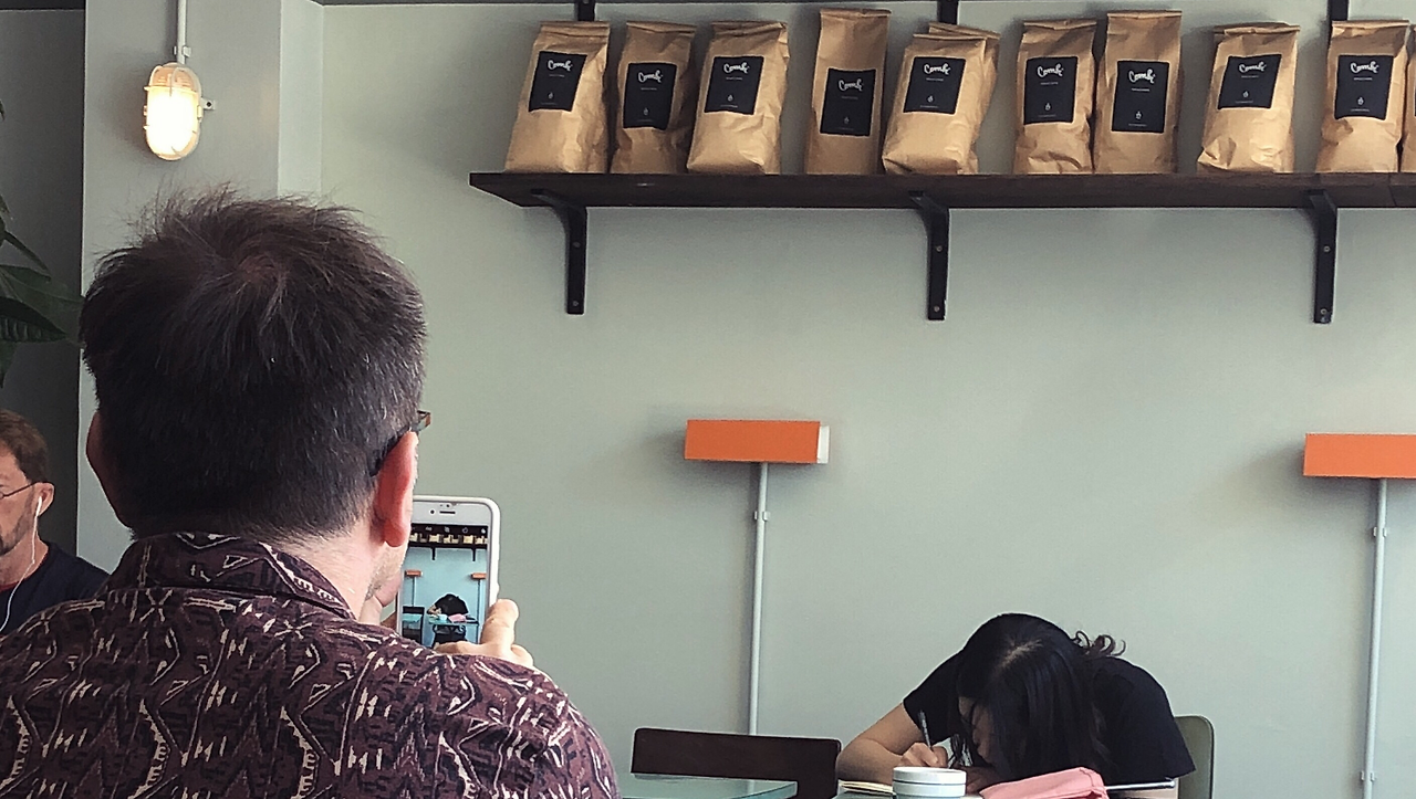 카페에 방문한 첫날, J는 일러스트 작업을 위해 콘센트가 있는 벽 쪽 자리에 앉고, 나는 맞은편 벽에 앉아 내 일을 했다. 크지 않은 가게라 열심히 그림을 그리는 J를 관찰할 수 있었는데, 어느 순간 나와 J 사이의 테이블에 다른 손님이 자리를 잡았다. 그런데 그가 돌발행동을 하기 시작했다.