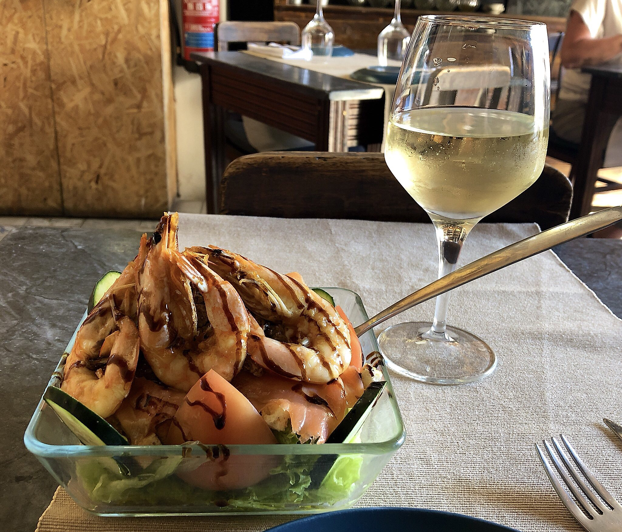 손님이라고는 노부부와 나뿐. 추천 받은 씨푸드 샐러드와 화이트 와인을 먹기 시작했다. 눈이 멀 것 같이 강렬한 볕이 작열하던 날이었는데, 신선한 요리와 차가운 술을 삼키자 온몸의 열기가 달아나는 기분이었다. 유명한 새끼돼지 통구이를 먹었대도 물론 나같이 쉽게 감동받는 사람은 무척 행복했을테지만, 그 순간에는 아무것도 아쉽지 않았다. 한가한 식당 안에서 점원들의 수다를 배경음 삼아 기분 좋은 식사를 마쳤다.