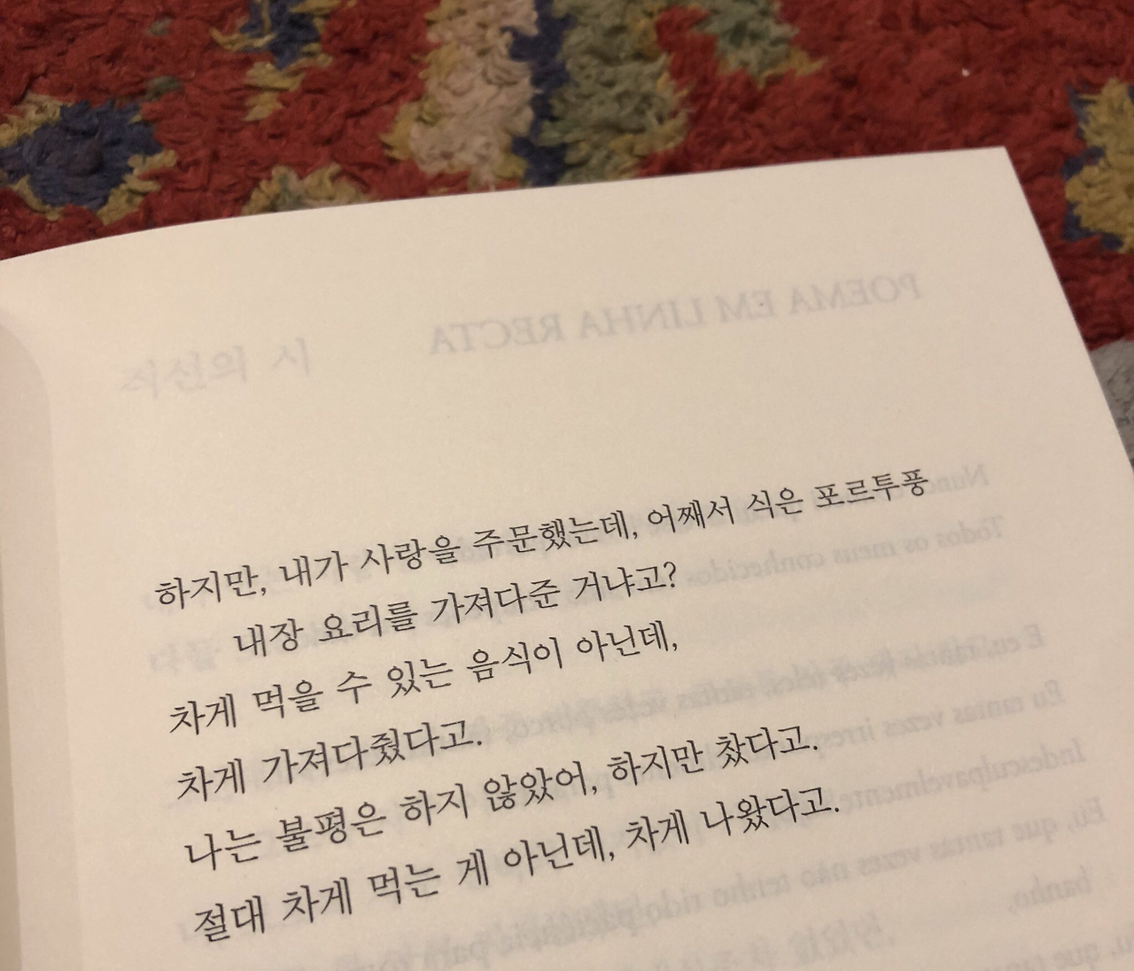 사랑을 주문했는데 식은 포르투풍 내장 요리가 나왔다니. 차게 먹는 음식이 아닌데 차게 나왔다니. 페소아의 비범한 은유가 마음에 들었다. 그래, 사랑을 주문했는데 식은 내장 요리가 나왔다면 허망하고 화도 날 법 하다.