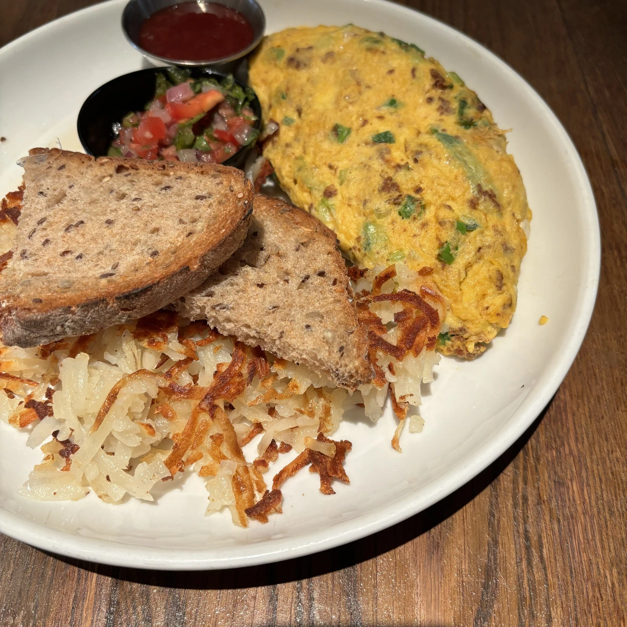 스패니쉬 오믈렛은 초리조(소시지의 일종), 할라피뇨, 파 등이 들어 있는 달걀 요리와 감자채 전(?)이 한 접시에 담겨 있다. 사이드로는 호밀빵, 딸기잼, 살사 소스가 나온다. 따뜻해서 그런지 하나하나 다 맛있었다. 달걀도 감자도 기름지지 않고 담백했다. 빵 위에 이것저것 올려 먹는 재미가 쏠쏠했다.