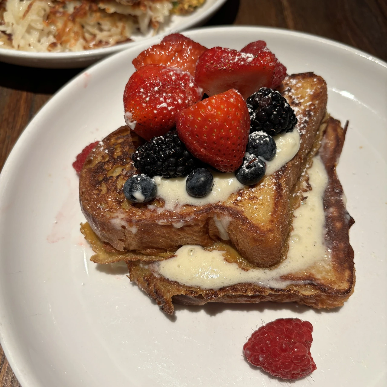 베리 마스카포네 프렌치토스트는 나의 로망 속 이미지처럼 과일과 크림이 듬뿍 올라가 있다. 두 장의 브리오슈 식빵이 겹쳐 있고, 그 사이엔 마스카포네 크림을 부어 촉촉함을 더한다. 위는 딸기, 라즈베리, 블루베리와 슈가 파우더가 장식한다. 여기에 메이플 시럽을 취향껏 뿌려 먹으면 된다. 분명 아는 맛인데 단맛과 상큼함의 조화도 좋고, 부드러우면서 가장자리는 쫄깃한 빵의 식감도 좋다.