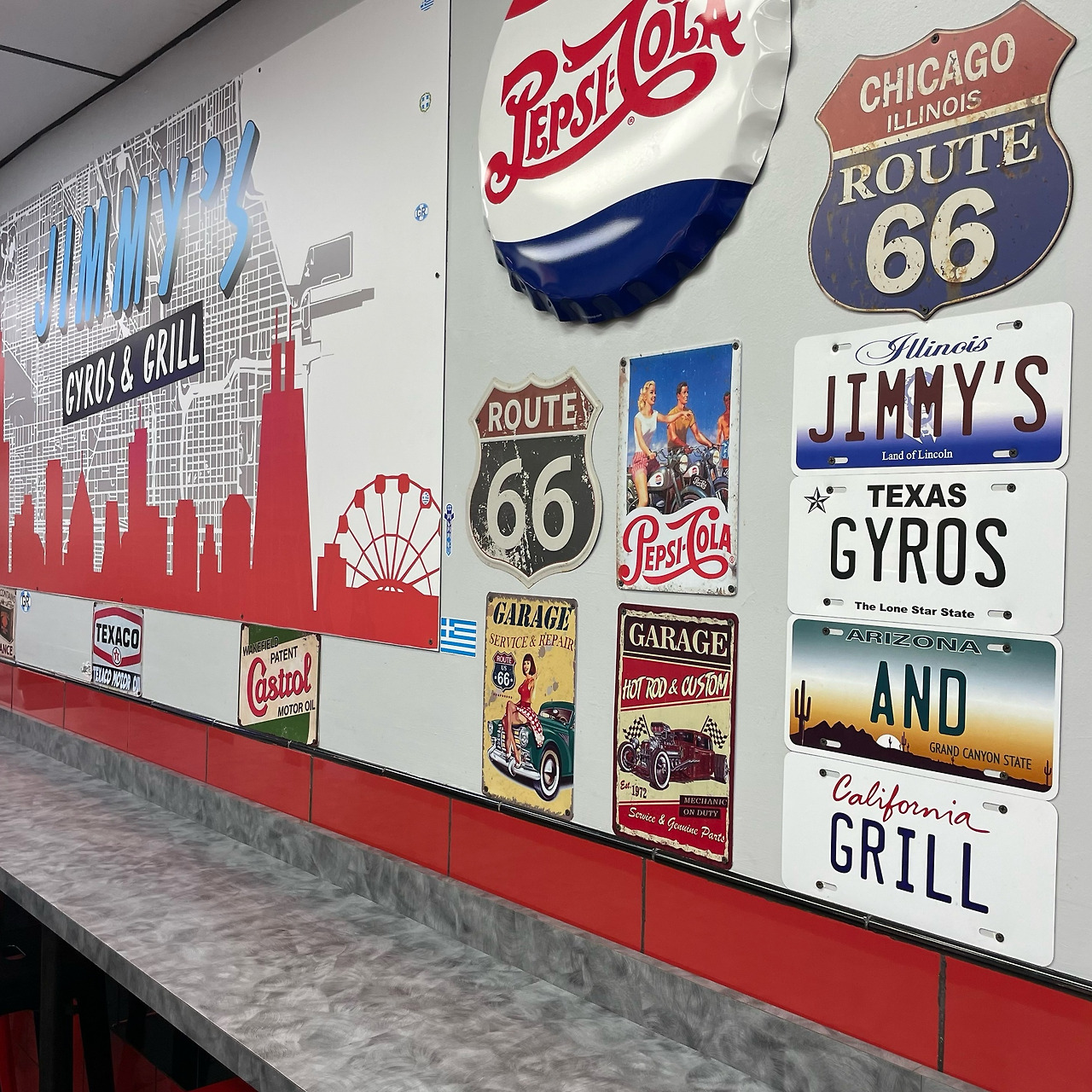 하나를 먹어보니 입맛이 싸악 돌며 다른 곳의 시카고식 핫도그들도 궁금해졌다. 바로 지하철을 타고 톰이 추천해 준 또 다른 식당으로 이동했다. 'Jimmy's'라는, 훨씬 작지만 안팎으로 강렬한 색이 눈에 띄는 곳이었다. 구이 요리 전문점이라 그리스식 고기구이인 기로스(Gyros)나 그냥 소시지 구이도 대표 메뉴였다.