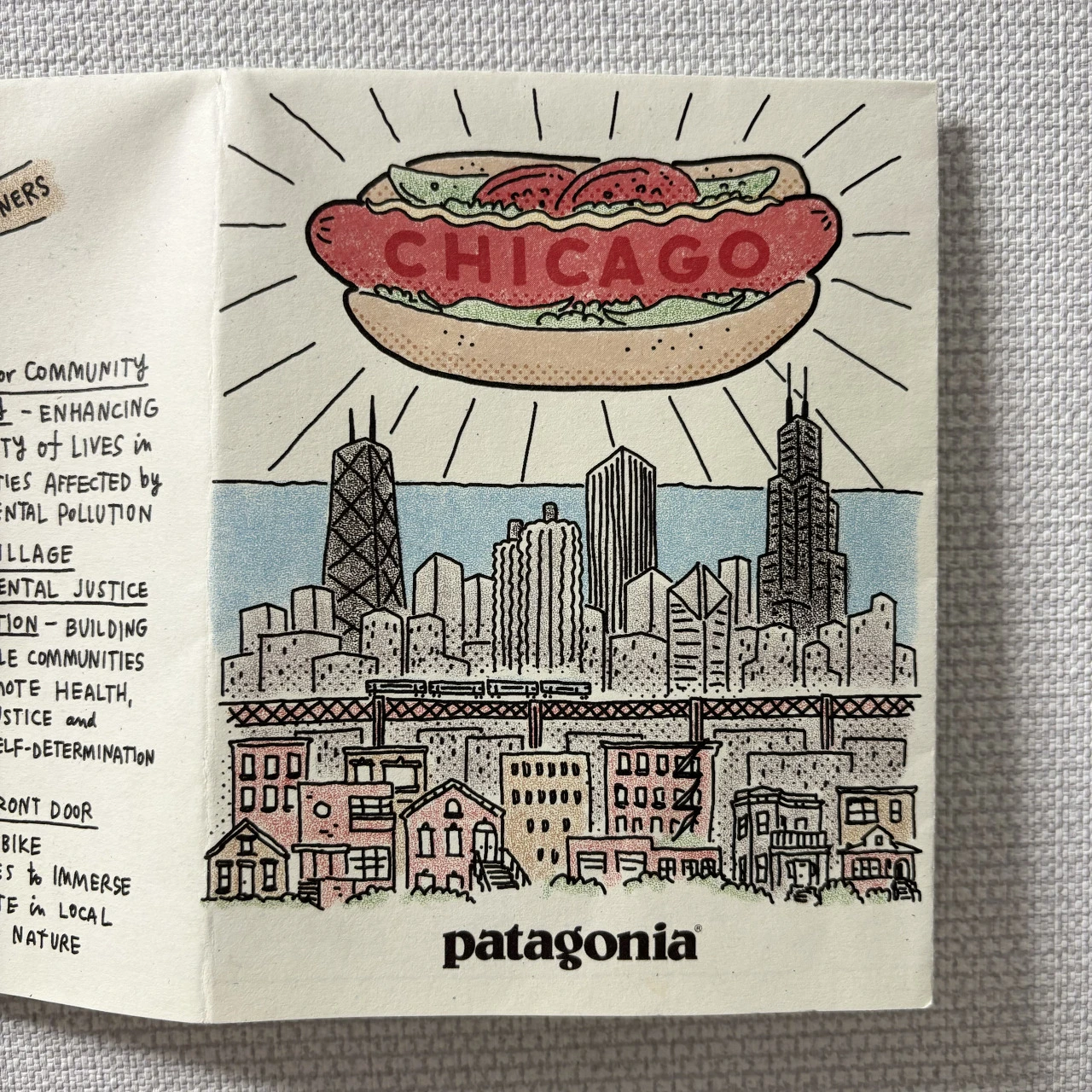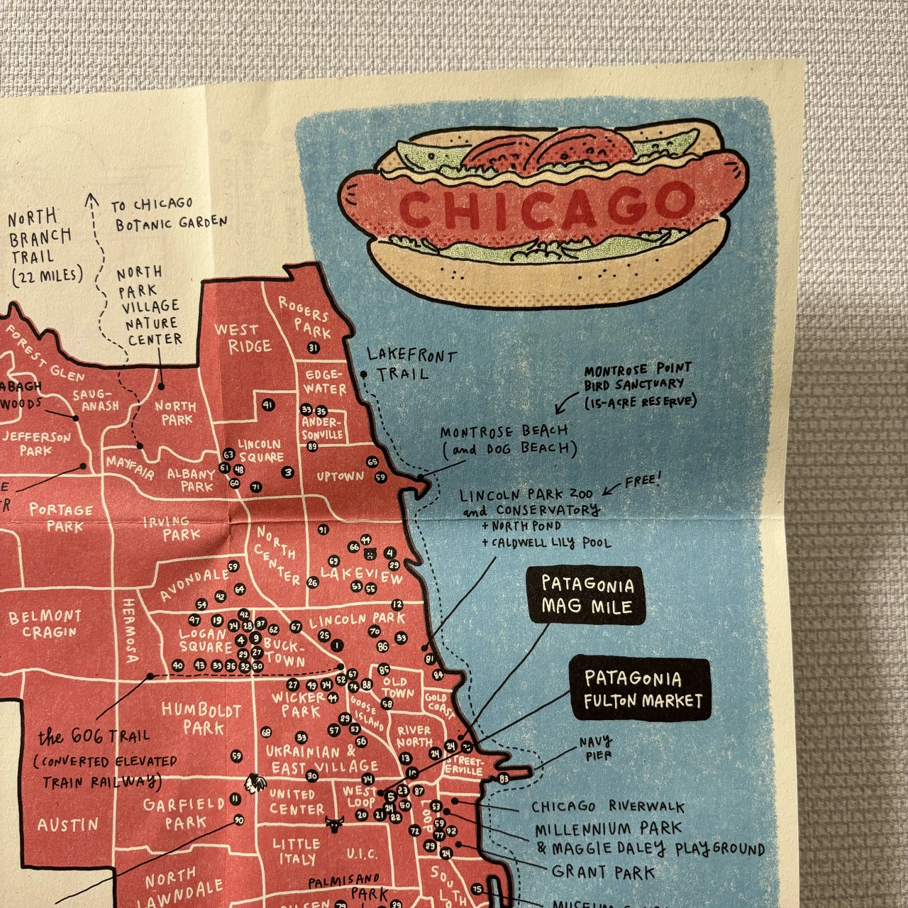 이 글을 쓰다 문득 궁금해져 미술용품점에서 기념품 삼아 사온 접시를 꺼내보았다. 여기도 있네. 잠깐, 파타고니아 매장에서 받은 일러스트형 시카고 지도에서도 핫도그를 본 것 같은데...? 맞네. 이쯤 되면 피자만큼이나, 아니면 그보다 더 핫도그가 시카고의 얼굴인 듯싶다.