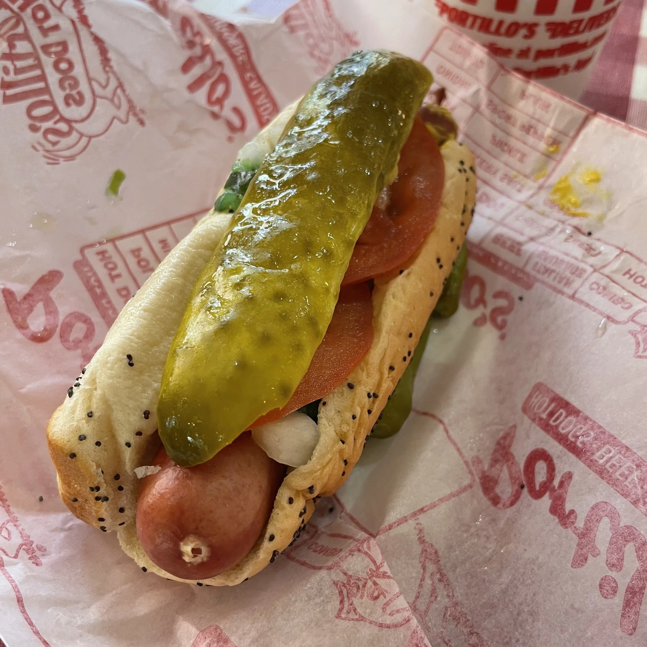 Portillo's Beef Hot Dog가 이곳에서는 시카고식 핫도그란다. 한 뼘 정도의 길이인 부들부들한 빵에 까만 씨앗이 잔뜩 붙어 있었다. 오케이, 빵 합격. 토핑도 일곱 가지 다 알차게 들어 있는 것 같았다. 육안으로 확인한 건 여섯 가지이긴 한데, 메뉴 설명에 셀러리 소금도 뿌렸다고 적혀 있었으니 믿어본다.