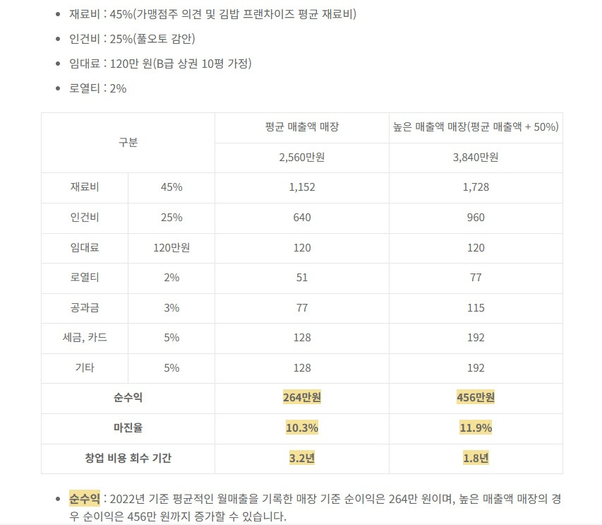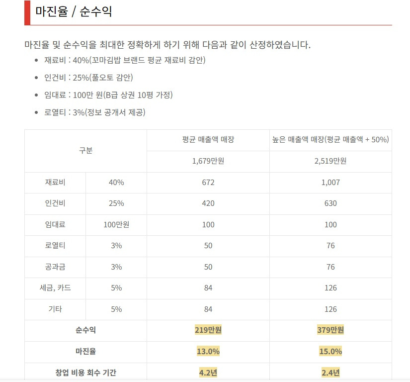 프랜차이즈 기준 보통 재료비는 40~45퍼센트가 나간다. 그리고 거기에 월세, 공과금, 카드부가세, 로열티등을 제외하고 순수익은 확 떨어지게 된다. 여기에 각종 달마다 나가는 정수키, 키오스크등 각종 렌탈비용도 고정지출이다. 그렇게 하여 나온 일반적인 김밥 프랜차이즈의 ' 정보공개서'에 나온 순 마진율은 평균이 15프로이다.